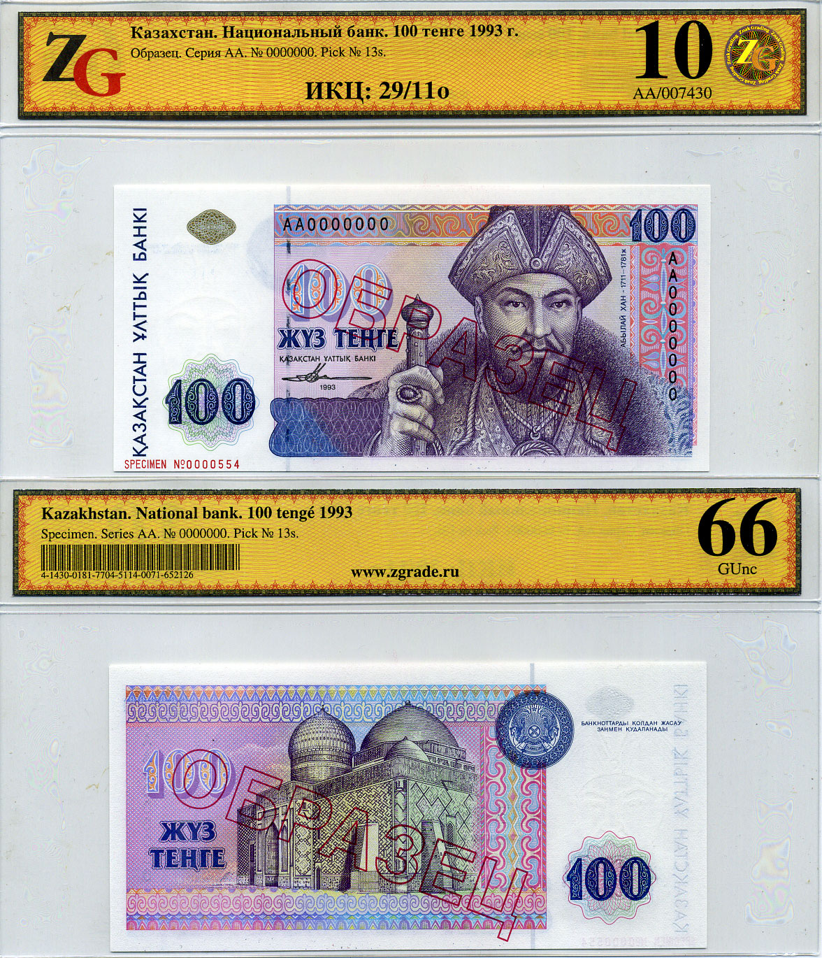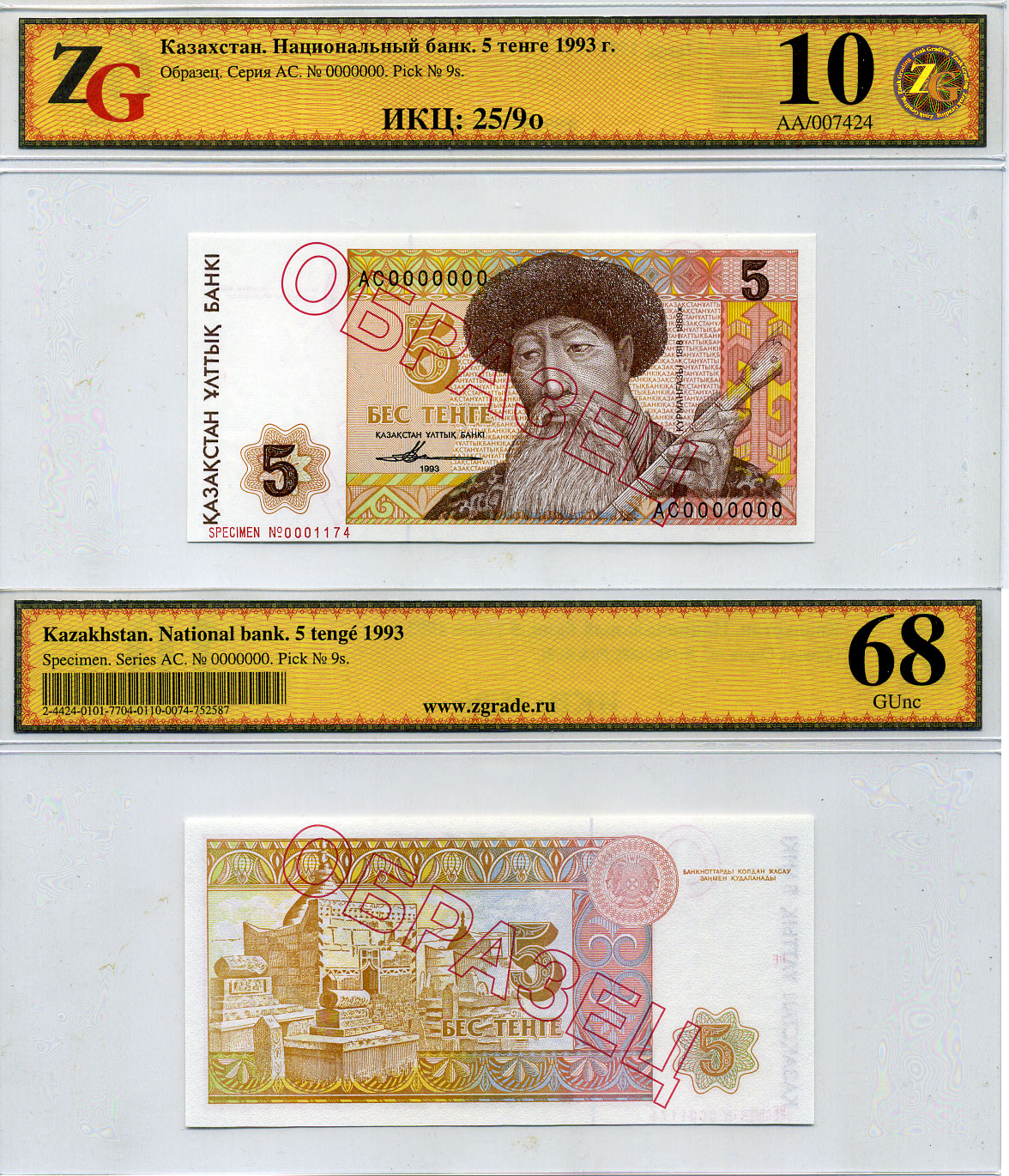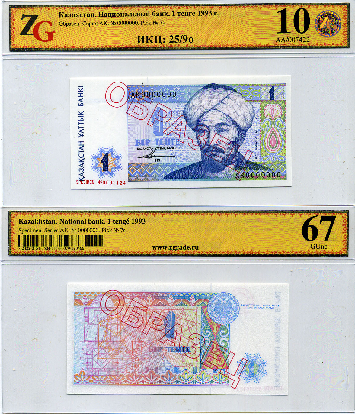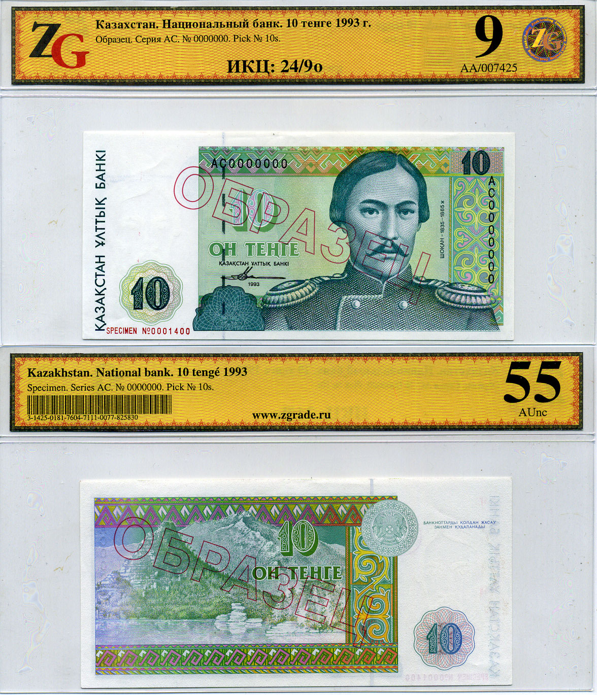 Казахстан набор из 10 банкнот 1993-1994 образец, в холдерах компании ZG. Сохранность - 9-10 Pick 7S, 8S, 9S, 10S, 11S, 12S, 13S, 14S, 15S, 16S бумага UNC (пресс) 452-1-75