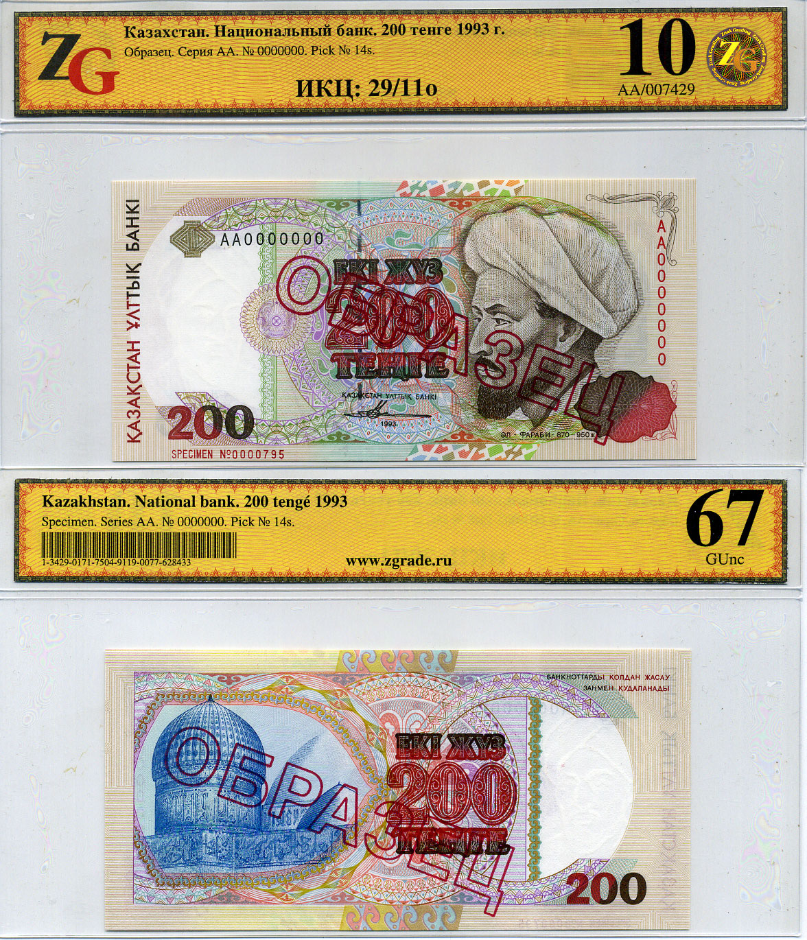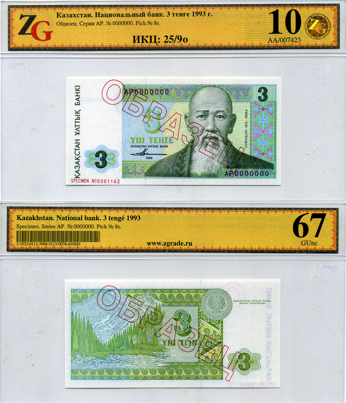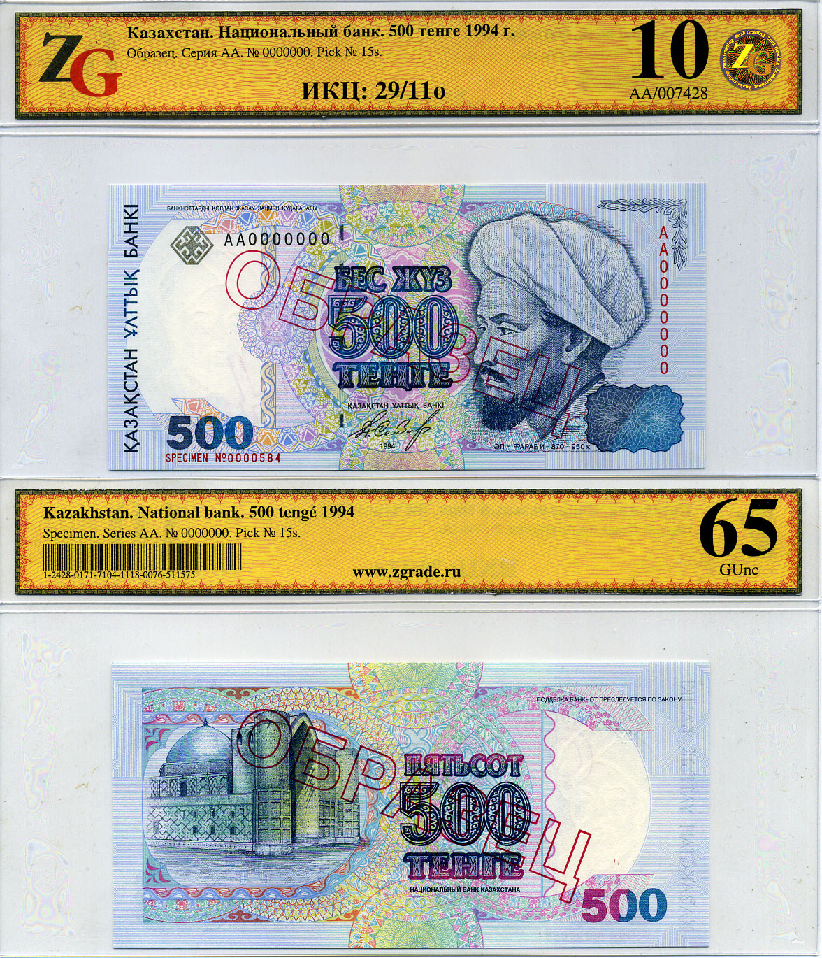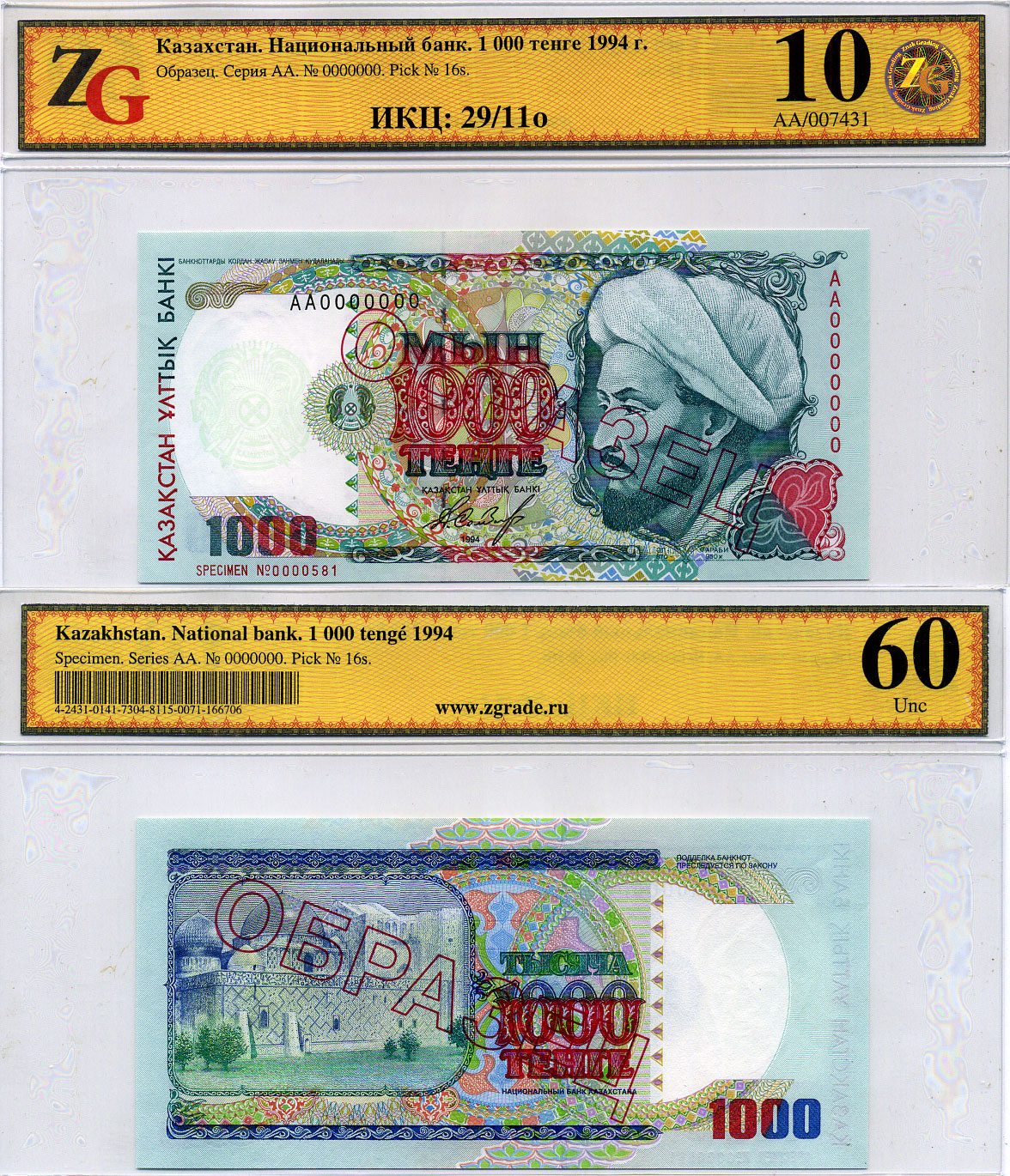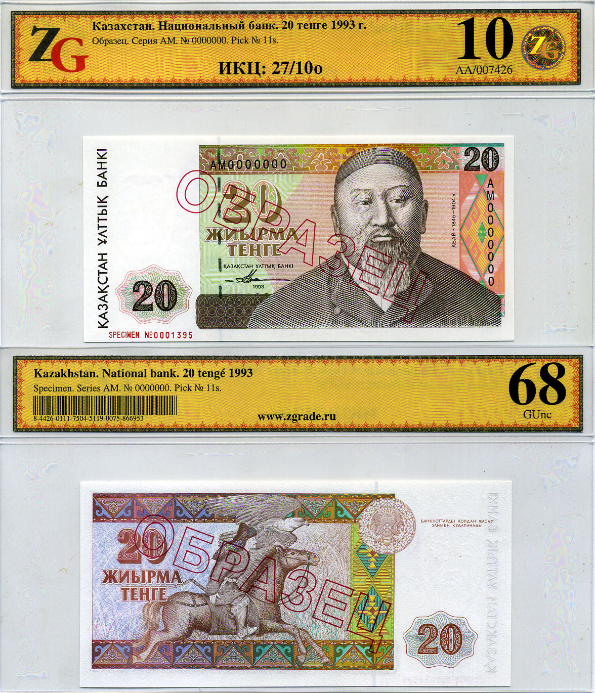 Казахстан набор из 10 банкнот 1993-1994 образец, в холдерах компании ZG. Сохранность - 9-10 Pick 7S, 8S, 9S, 10S, 11S, 12S, 13S, 14S, 15S, 16S бумага UNC (пресс) 452-1-75