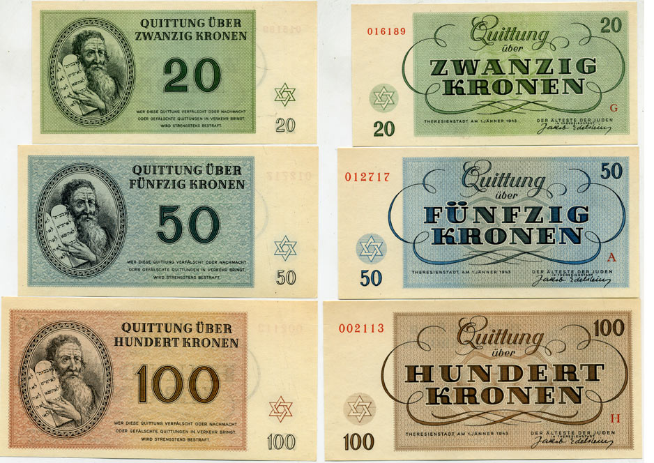 Чехия, Терезинштадт набор из 7 банкнот 1, 2, 5, 10, 20, 50, 100 крон 1943 Терезинское гетто, Еврейское гетто, лагерные деньги бумага UNC (пресс) 451-334-1
