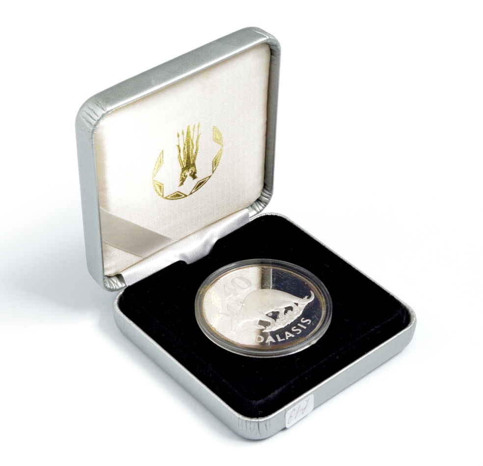 Гамбия 40 даласи 1977 серия защита окружающей среды, трубкозуб, африканский муравьед, тираж 4183 экз., в коробке KM 18 серебро PROOF 7-4-1-45