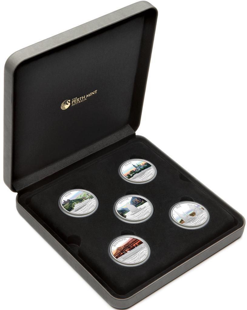 Тувалу набор из 5 монет 2010 великие реки мира, в оригинальной коробке, с сертификатом, цветная эмаль KM NEW серебро PROOF 14-01-02-04