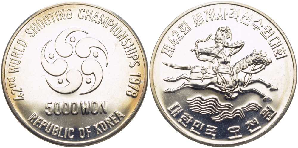 ЮЖНАЯ КОРЕЯ 5000 ВОН 1978 42 ЧЕМПИОНАТ МИРА ПО СТРЕЛЬБЕ 1978 ГОДА, СТАРИННЫЙ МОТИВ KM 23 серебро PROOF 06-245-36