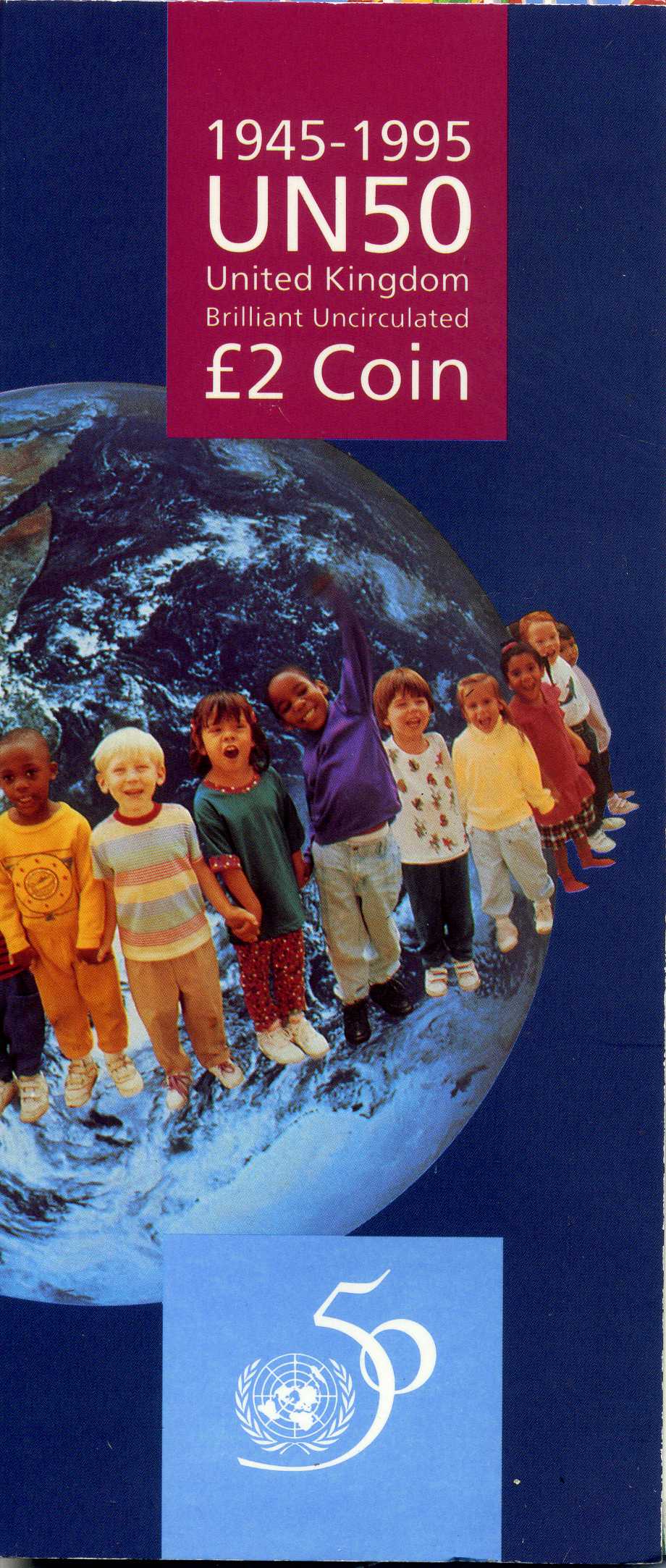 Великобритания 2 фунта 1995 Елизавета II (1952-2022), 50 лет ООН, в оригинальном картонном буклете KM 971, Spink 4316 (K6) никель латунь BUNC 00-00