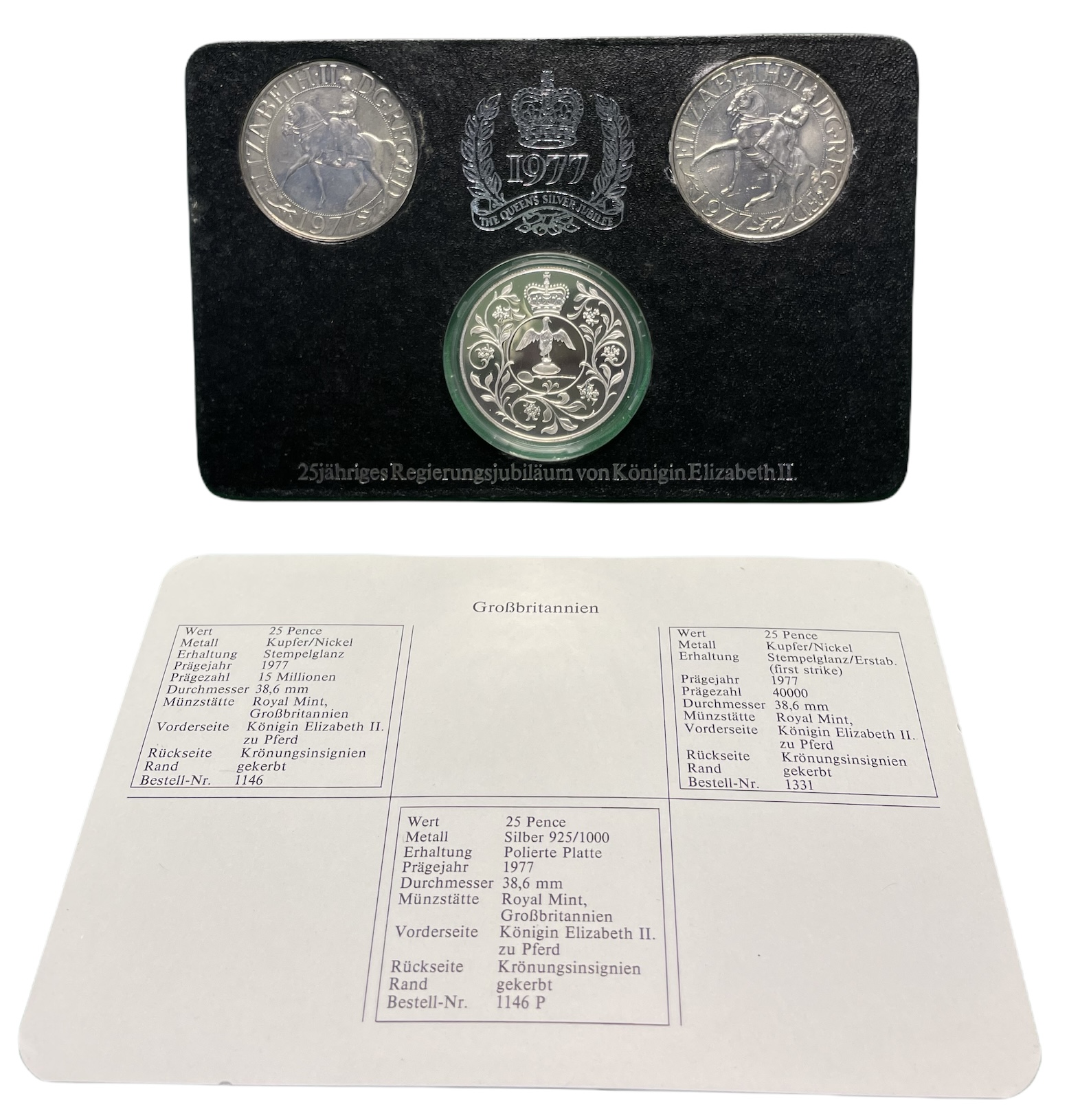 Великобритания набор из 3 монет по 25 пенсов 1977 25 лет со дня коронации Елизаветы, Елизавета II (1952-2022) KM 894 и 920a, Spink 4136 и 4227 медно-никель, серебро PROOF, UNC, UNC 7-5-1-14