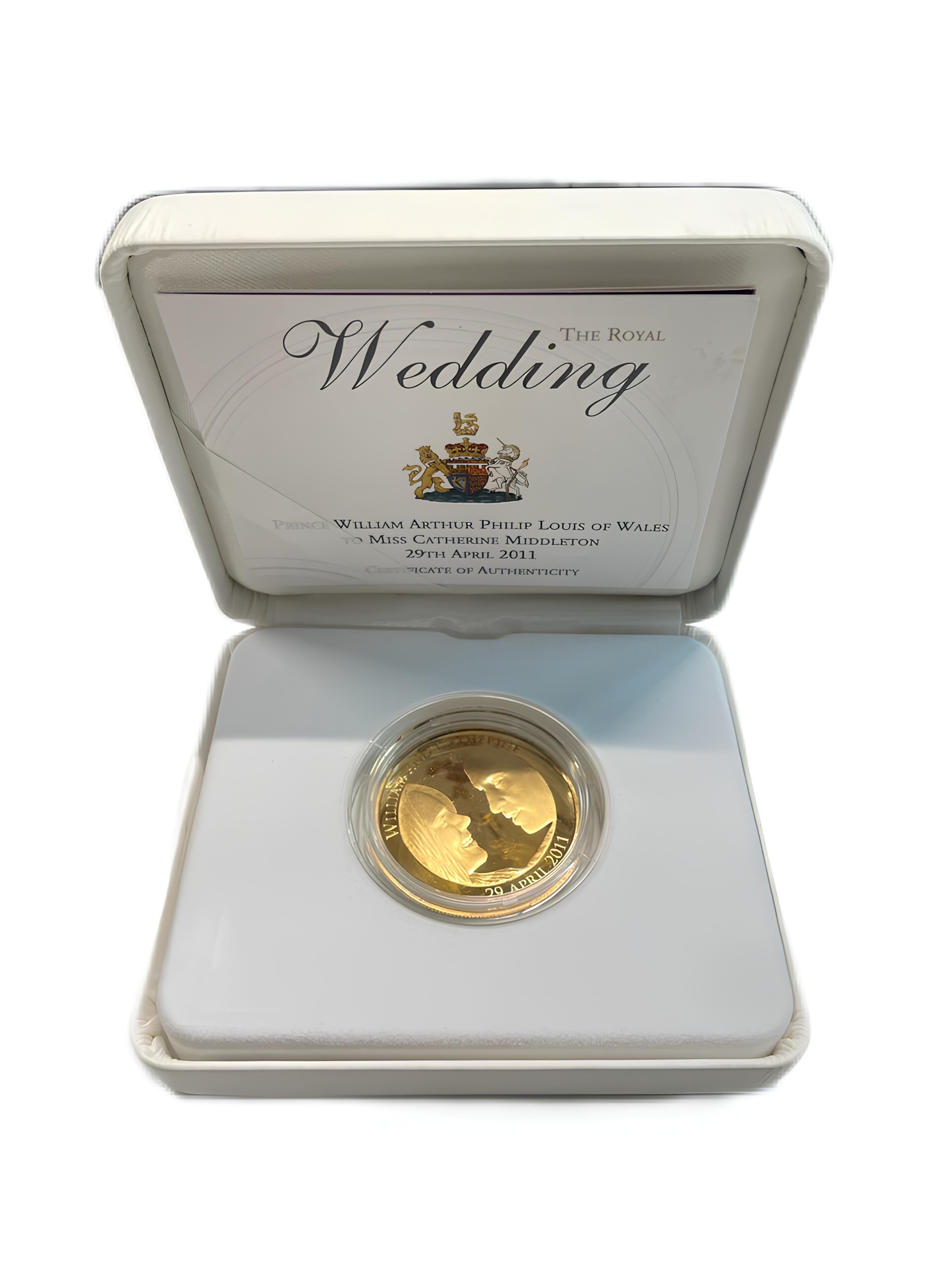 Великобритания 5 фунтов 2011 Елизавета II (1952-2022), королевская свадьба принца Уильяма и Кэтрин (Кейт) Миддлтон, в оригинальной коробке KM 1203b, Spink L22 позолота, серебро PROOF 8-2-04-17