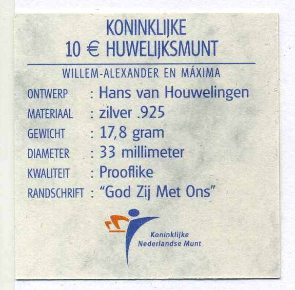 Нидерланды 10 евро 2002 свадьба а Виллема-Александра и Максимы, в оригинальной коробке, сертификат, вес 17,8 гр., проба 925 KM 243 серебро PROOFLIKE 00-00-00