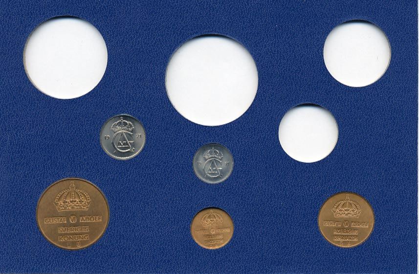 Швеция 1, 2, 5, 10, 25 эре 1971 Густав VI Адольф (1950-1973) в картоне набора монетного двора UNC 7-5-7-256