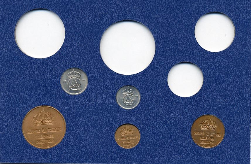 Швеция 1, 2, 5, 10, 25 эре 1971 Густав VI Адольф (1950-1973) в картоне набора монетного двора UNC 7-5-7-258