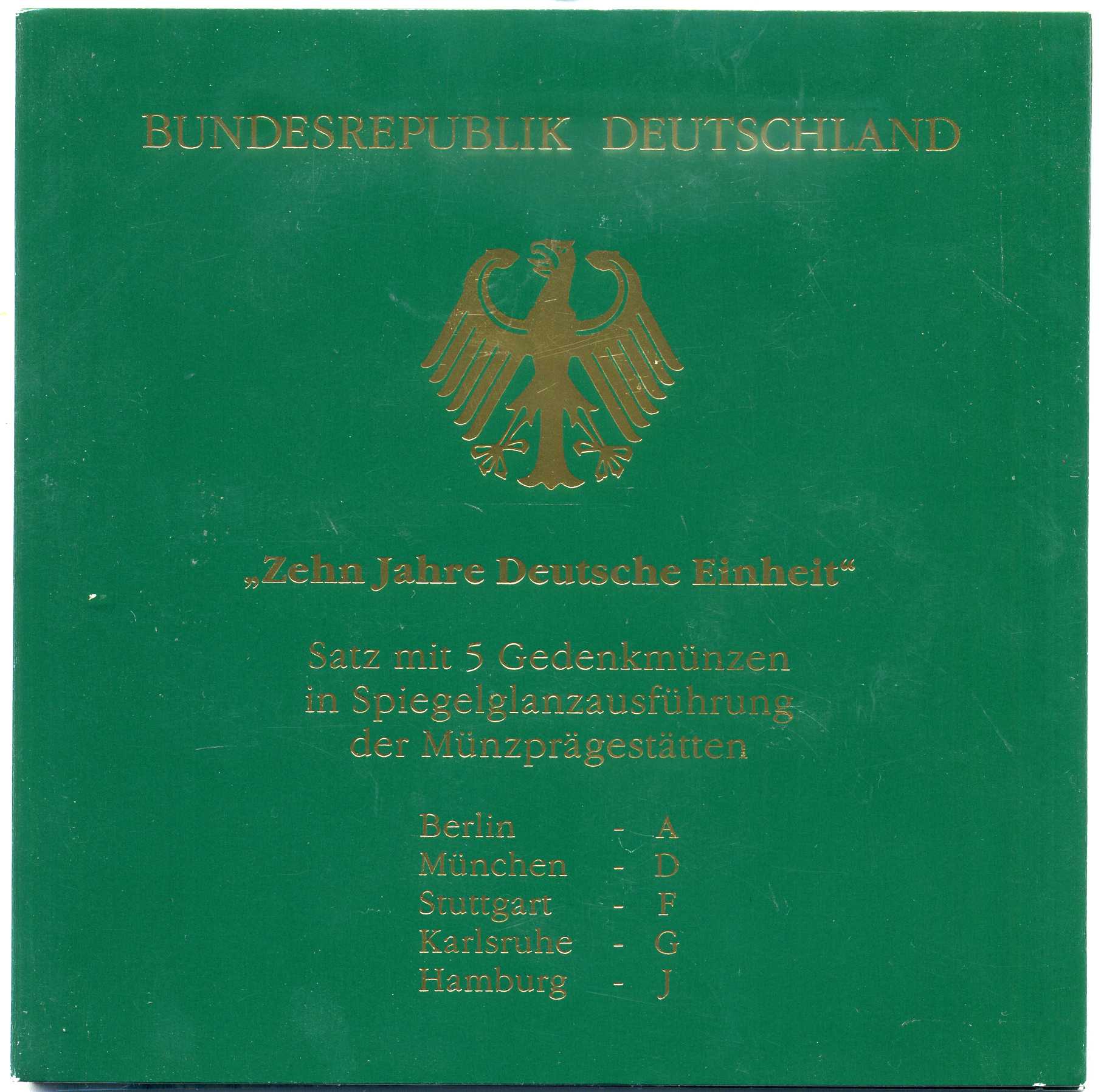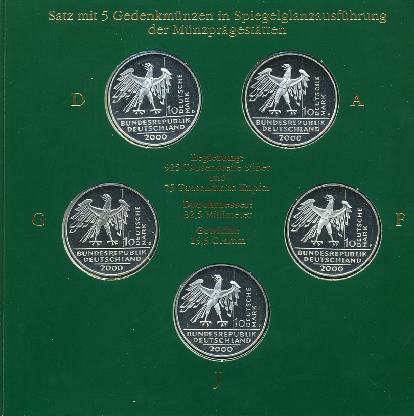 ФРГ набор из 5 штук по 10 марок 2000 A, D, F, G, J, 10 лет немецкого единства KM 201 серебро PROOF 6-5-2-12