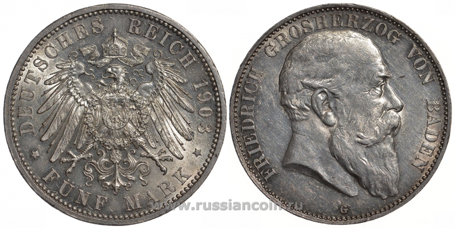 -Баден 5 марок 1903 G, Фридрих I (1856-1907) Weege 31, J. 33, KM 274 серебро aUNC 00-815-45Пруссия - PreussenразноеРейс - ReussСаксен-Алтенбург - Sachsen-AltenburgСаксен-Веймар-Айзенах - Sachsen-Weimar-EisenachСаксен-Кобург-Гота - Sachsen-Coburg-GothaСаксен-Майнинген - Sachsen-MeiningenСаксония - SachsenШаумбург-Липпе - Schaumburg-LippeШварцбург - SchwarzburgАнгальт - AnhaltМекленбург-СтрелицОльденбург - OldenburgМекленбург-Шверин - Meklenburg-SchwerinЛюбек - LubeckЛиппе - LippeГессен - HessenГамбург - HamburgВюртемберг - WurttembergБремен - BremenБрауншвейг-Люнебург - Braunschweig-LuneburgБавария - BayrenОбщегерманские номиналы