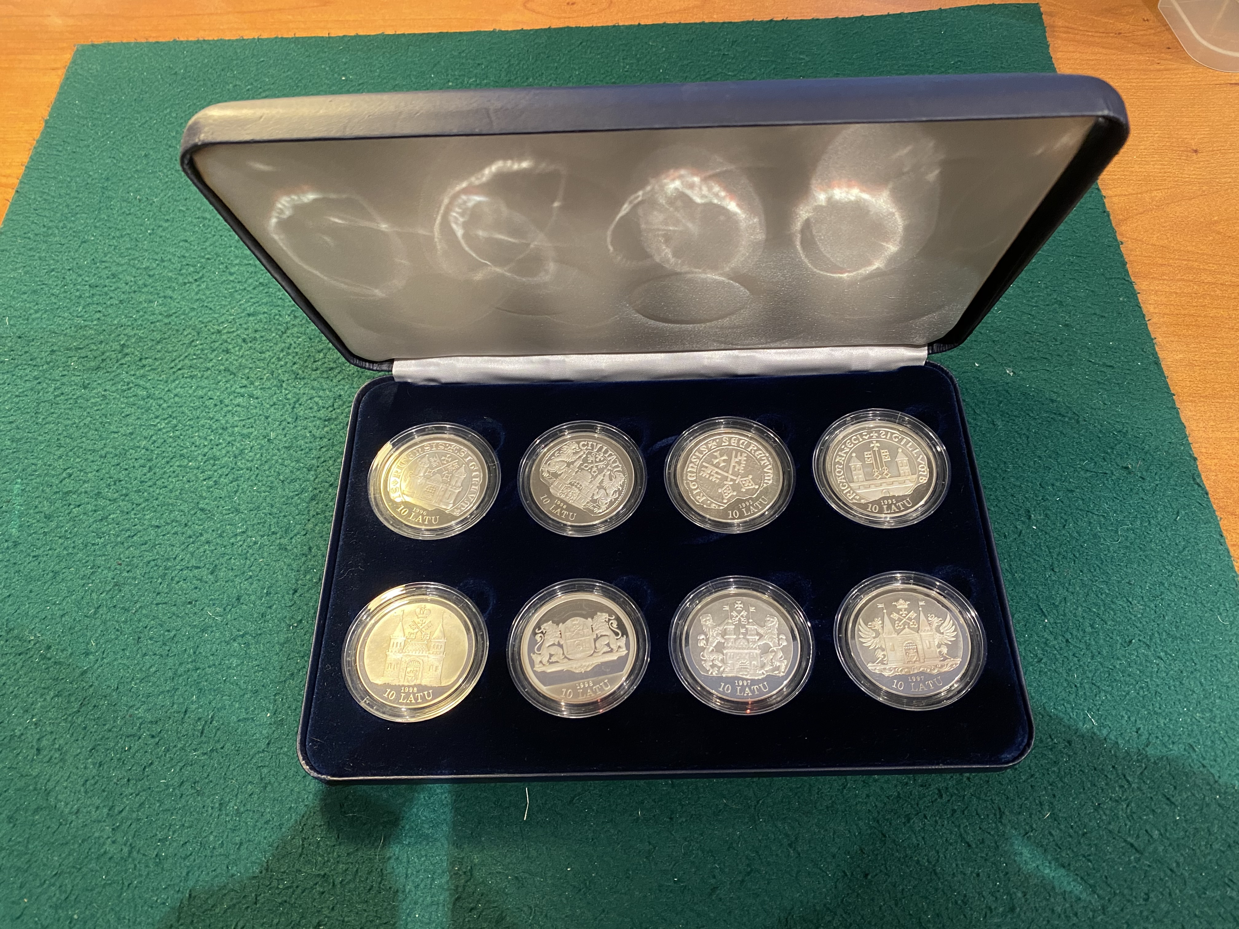 Латвия официальный набор из 8 монет по 10 лат 1995-1998 800 лет Риге, в оригинальной коробке серебро PROOF 14-01-01-07