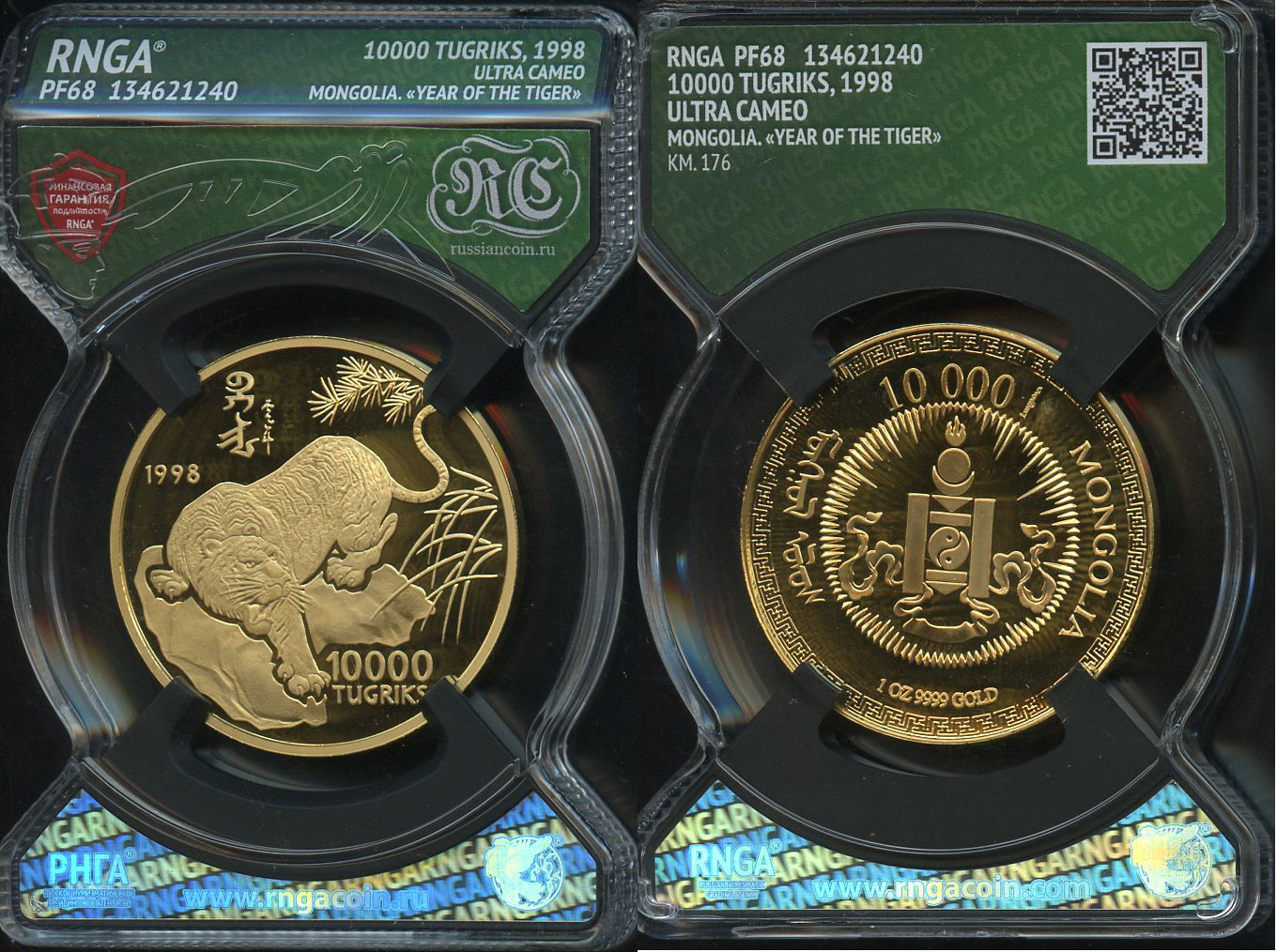 Монголия 10000 тугриков 1998 год Тигра, тираж 250 экземпляров, в слабе RNGA PF 68 Ulta Cameo KM 176 золото PROOF 15-006-02