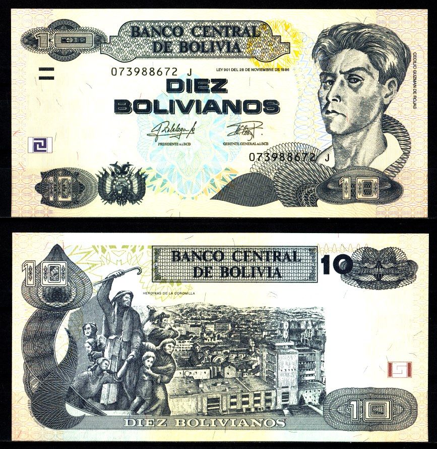 Боливия 10 боливиано 1986 Сесилио Гусман де Рохас, памятник "Heroinas de la Coronilla", Кочабамба Pick 243 (1) бумага UNC (пресс) 7523-37-2-1