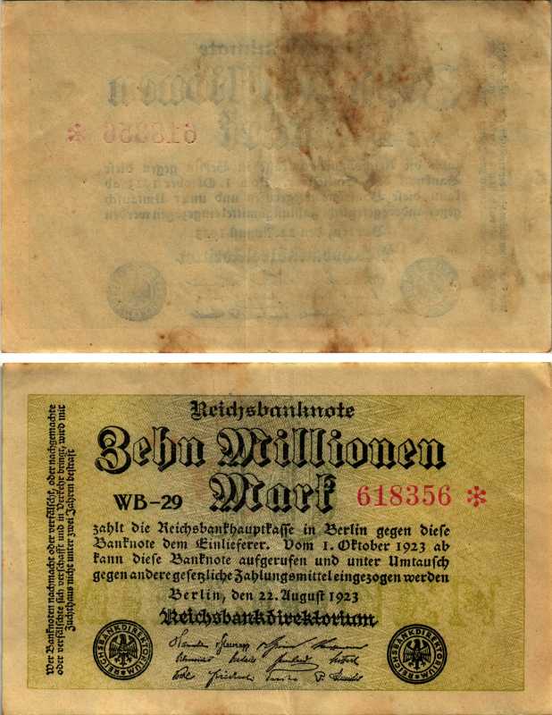 ГЕРМАНИЯ 10000000 МАРОК 1923 22 АВГУСТА 1923, ВОДЯНОЙ ЗНАК Е, В ЗВЁЗДАХ G/D Pick 106а бумага 7487-19-1-1