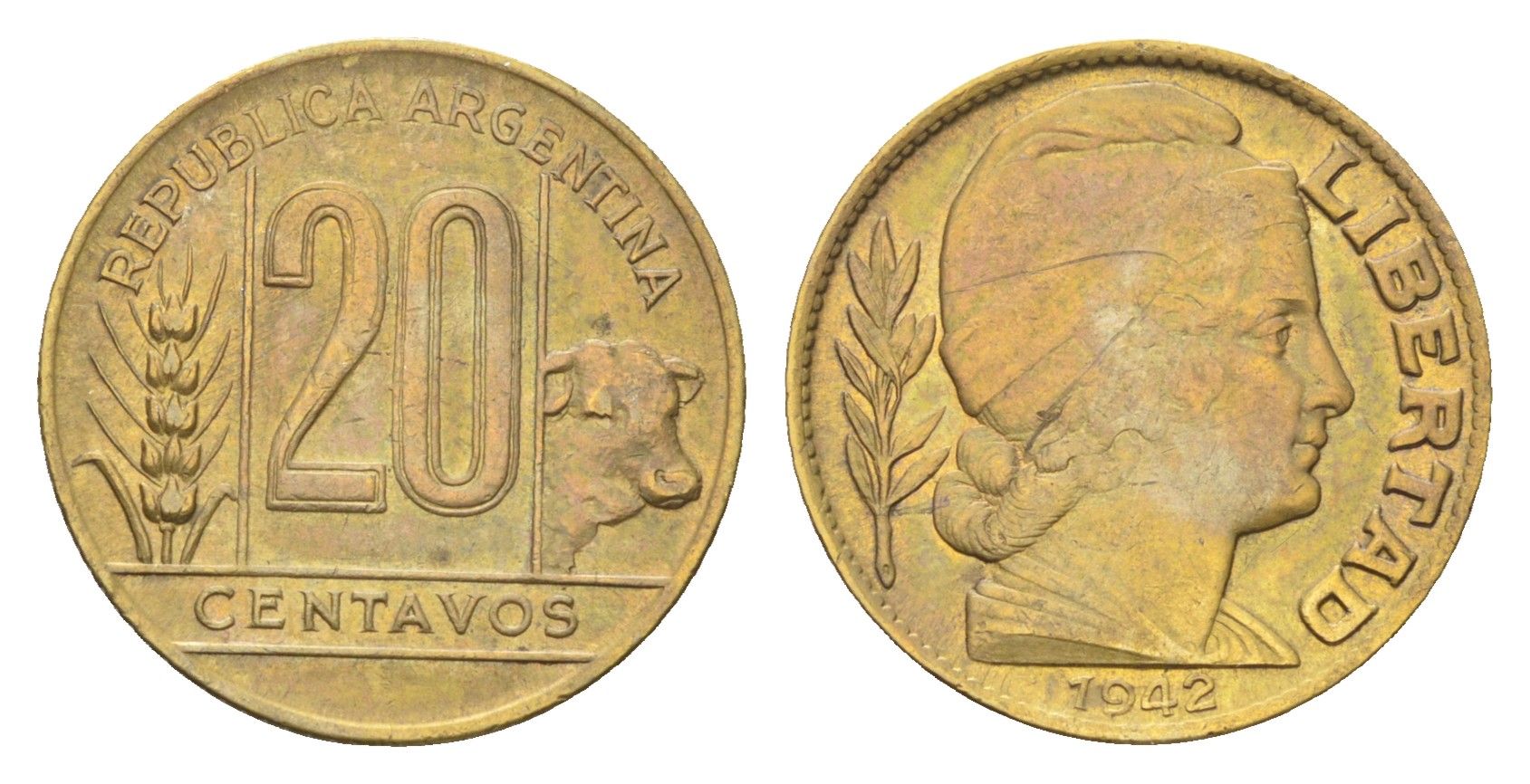 Аргентина 20 сентаво 1942 KM 42 алюминиевая бронза 4664-147