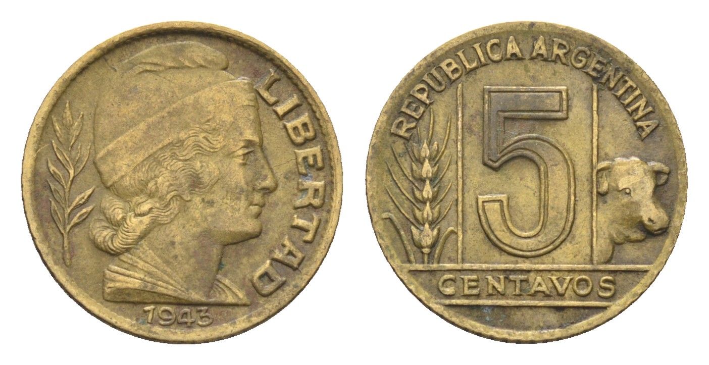 Аргентина 5 сентаво 1943 KM 40 алюминиевая бронза 4664-536