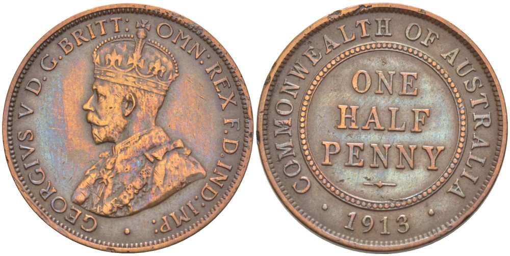 АВСТРАЛИЯ 1/2 ПЕННИ 1913 L, ГЕОРГ V (1910-1936) KM 22 бронза 4514-616