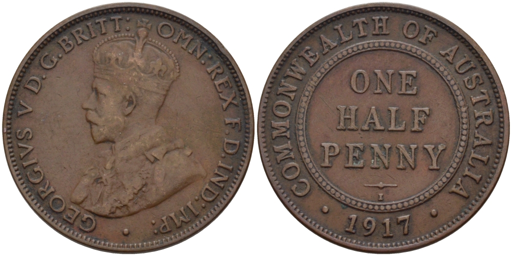 АВСТРАЛИЯ 1/2 ПЕННИ 1917 ГЕОРГ V KM 22 бронза 67-1213