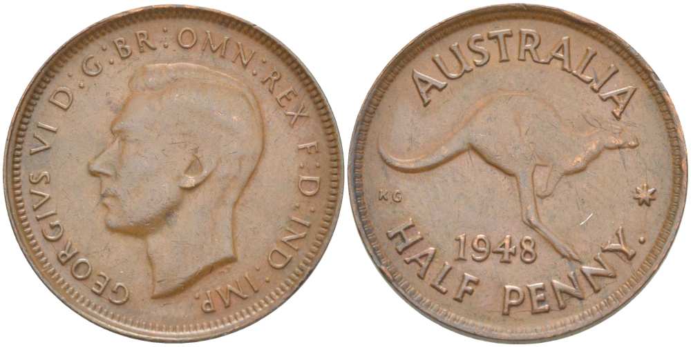 АВСТРАЛИЯ 1/2 ПЕННИ 1948 p, ГЕОРГ VI (1936-1952), КЕНГУРУ KM 41 бронза 4514-831