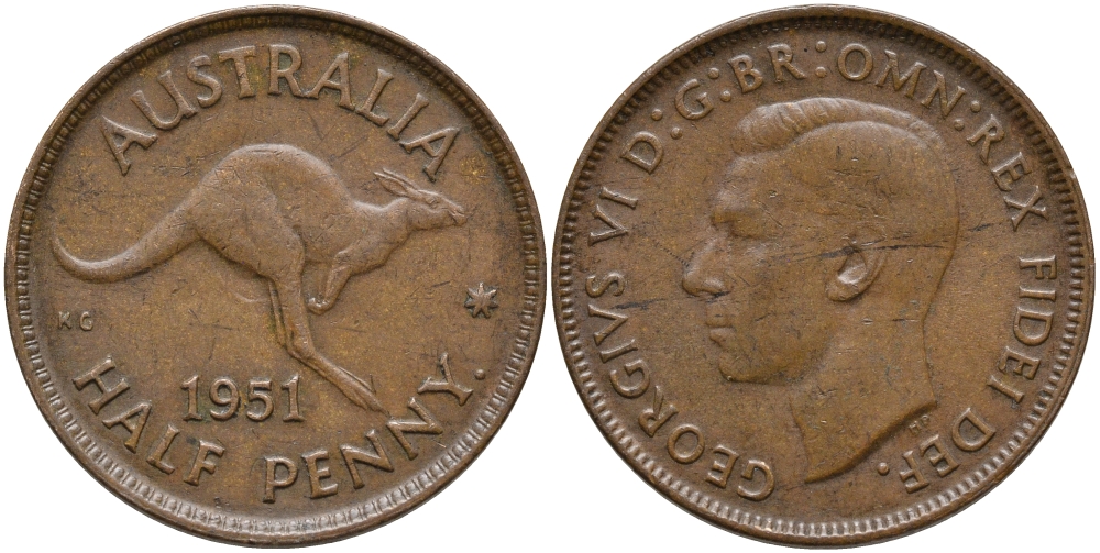 АВСТРАЛИЯ 1/2 ПЕННИ 1951 p, ГЕОРГ VI (1936-1952), КЕНГУРУ, С ТОЧКОЙ KM 42 бронза 93-1137