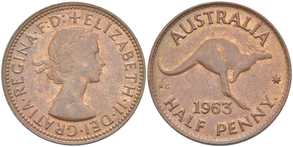 АВСТРАЛИЯ 1/2 ПЕННИ 1963 p, ЕЛИЗАВЕТА II (1953-), КЕНГУРУ KM 61 бронза 4514-843