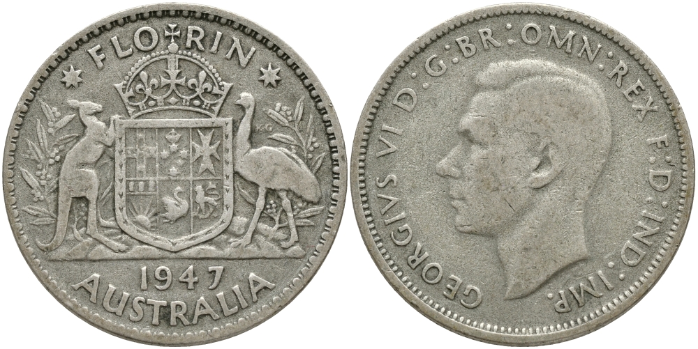 Австралия 1 флорин 1947 Георг VI, герб Австралии KM 40а серебро 1528-742
