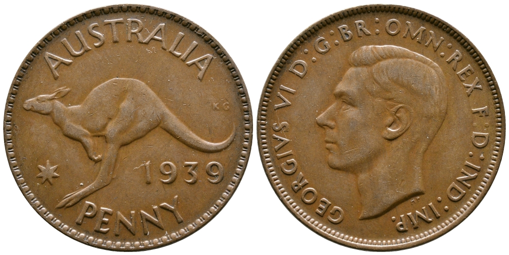 Австралия 1 пенни 1939 Георг VI (1936-1952), кенгуру KM 36 бронза 4557-912