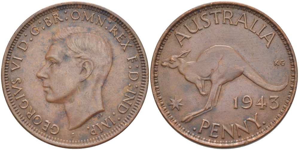 Австралия 1 пенни 1943 b, Георг VI (1936-1952), кенгуру, с буквой I KM 36 бронза 4512-1133