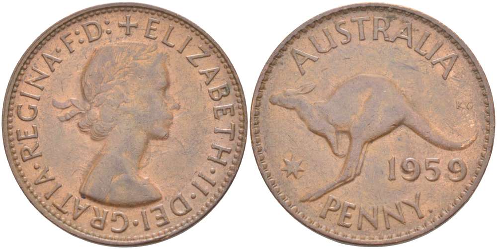 АВСТРАЛИЯ 1 ПЕННИ 1959 р, ЕЛИЗАВЕТА II (1953-), КЕНГУРУ KM 56 бронза 32-725