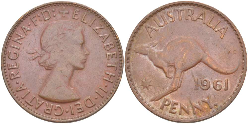 АВСТРАЛИЯ 1 ПЕННИ 1961 p, ЕЛИЗАВЕТА II (1953-), КЕНГУРУ KM 56 бронза 4512-1215