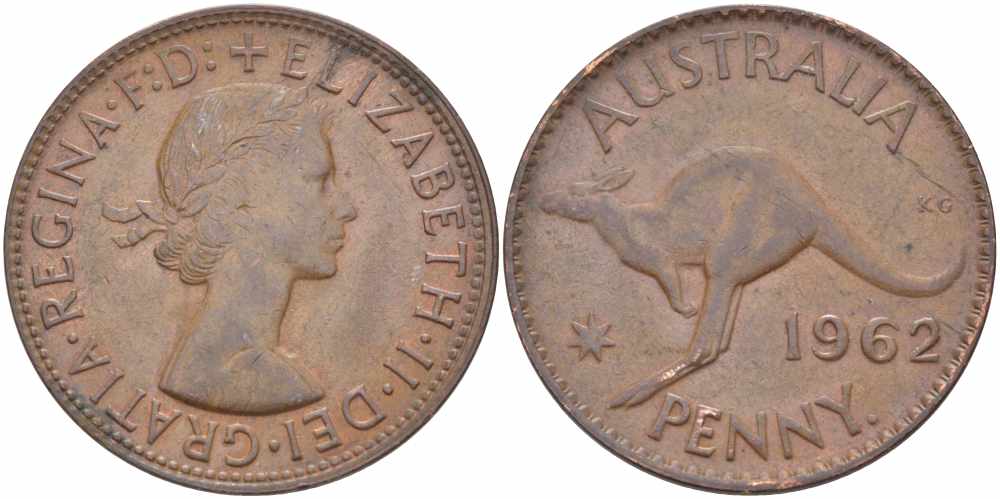АВСТРАЛИЯ 1 ПЕННИ 1962 p, ЕЛИЗАВЕТА II (1953-), КЕНГУРУ KM 56 бронза 109-524