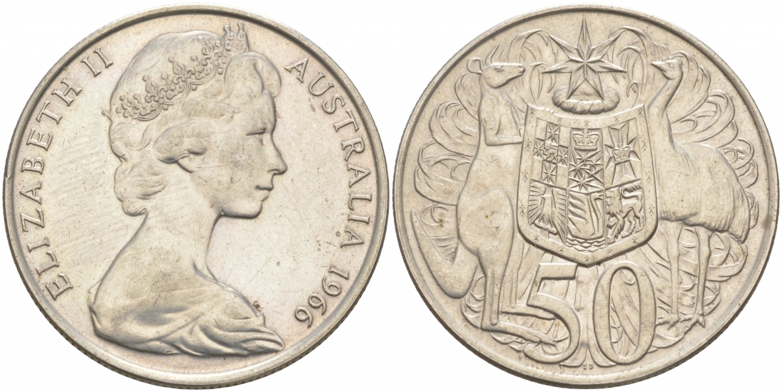 АВСТРАЛИЯ 50 ЦЕНТОВ 1966 ЕЛИЗАВЕТА II, МОЛОДОЙ ПОРТРЕТ, ГЕРБ АВСТРАЛИИ KM 67 серебро UNC 69-1023