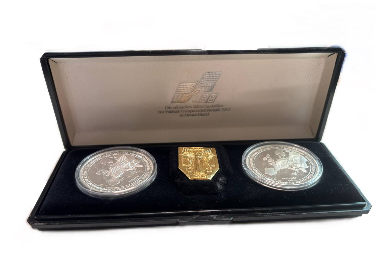 Германия набор из 2 медалей посвященных Чемпионату Европы по футболу 1988 проходившим ФРГ, а также памятного значка в честь победы сборной ФРГ на Чемпионате Мира в 1954 году 1987 медали - диаметр 40 мм, вес 19,91 гр; размер значка 30x23 мм PROOF 8-2-05-43
