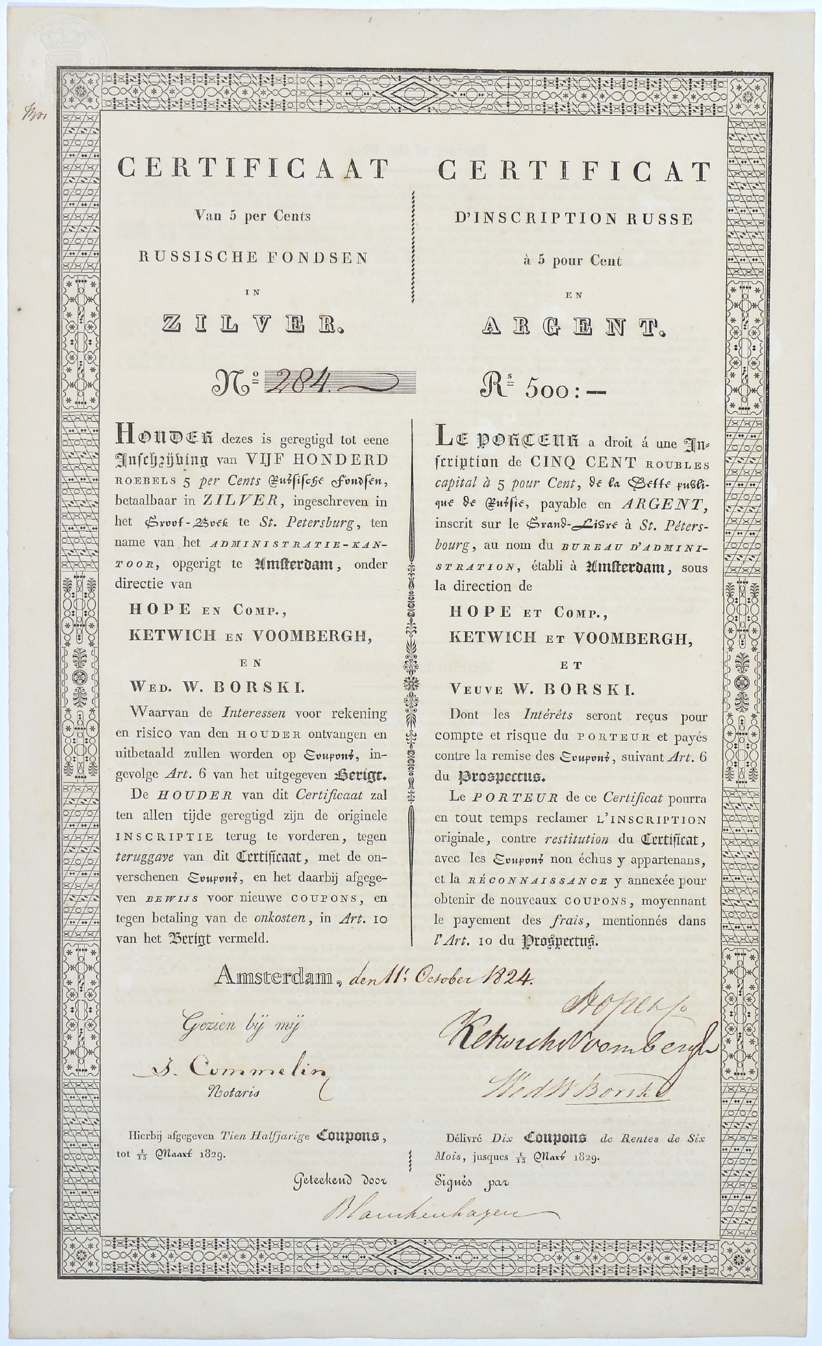 РОССИЯ 5% АКЦИЯ НА 500 РУБЛЕЙ 1824 АМСТЕРДАМ бумага 49-22-1
