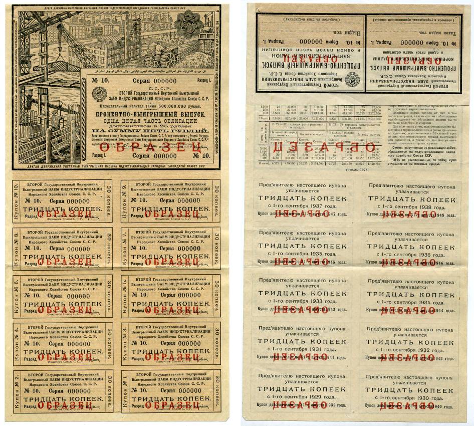 СССР Второй государственный внутренний выигрышный заем индустриализации народного хозяйства СССР. Процентно-выигрышный выпуск. 5 рублей, 1/5 облигации 1928 ОБРАЗЕЦ Золотарев 28.4.1 бумага UNC (пресс) 451-270-1