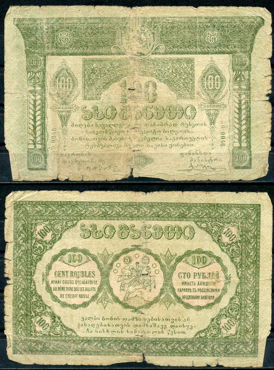 Грузинская Демократическая Республика 100 рублей 1919 светло-зеленая. В серии две литеры Pick 12, Кардаков К8.2.12 бумага 439-29-2-2