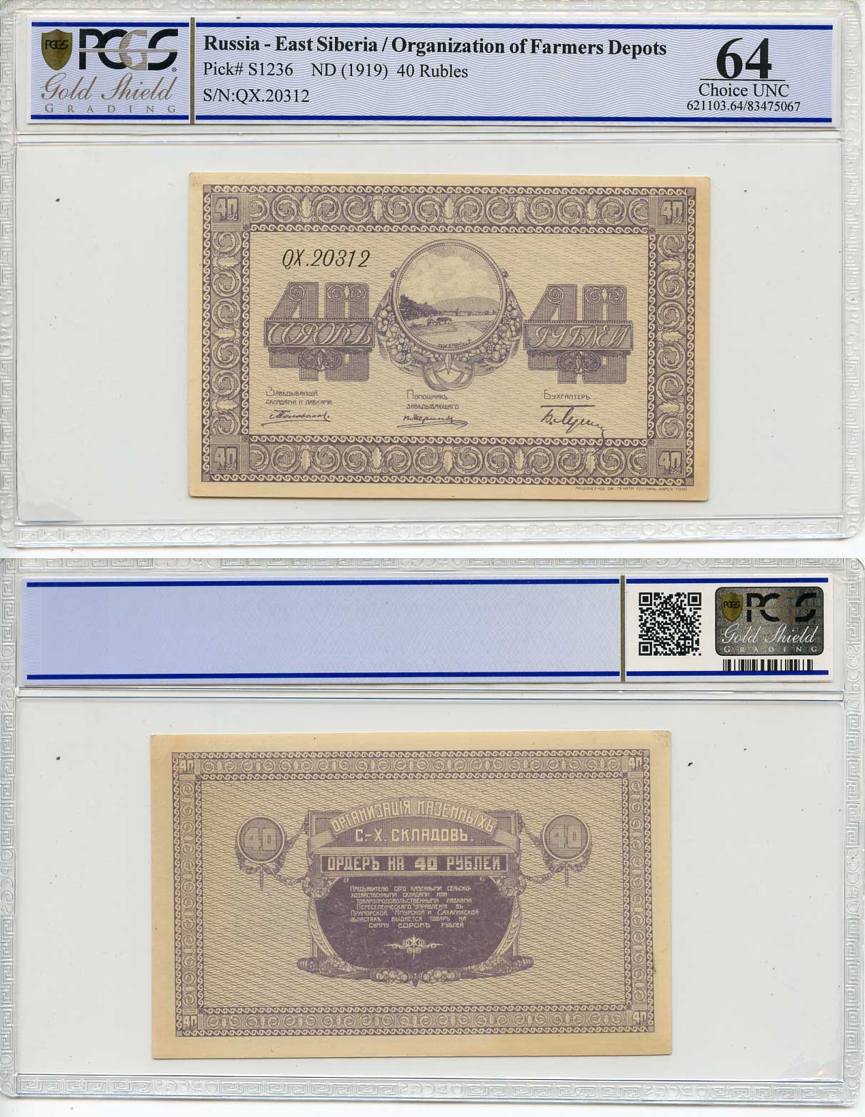 Никольск-Уссурийск. Приморская область 1, 3, 5, 10, 20, 40 и 100 рублей ND (1919) Переселенческое управление. Организация Сельско-Хозяйственных складов. Ордер. В слабах PCGS 62-64 Кардаков, с. 243, раздел 40, № 1-7, Pick S1231-S1237 бумага UNC (пресс) 452-2-19