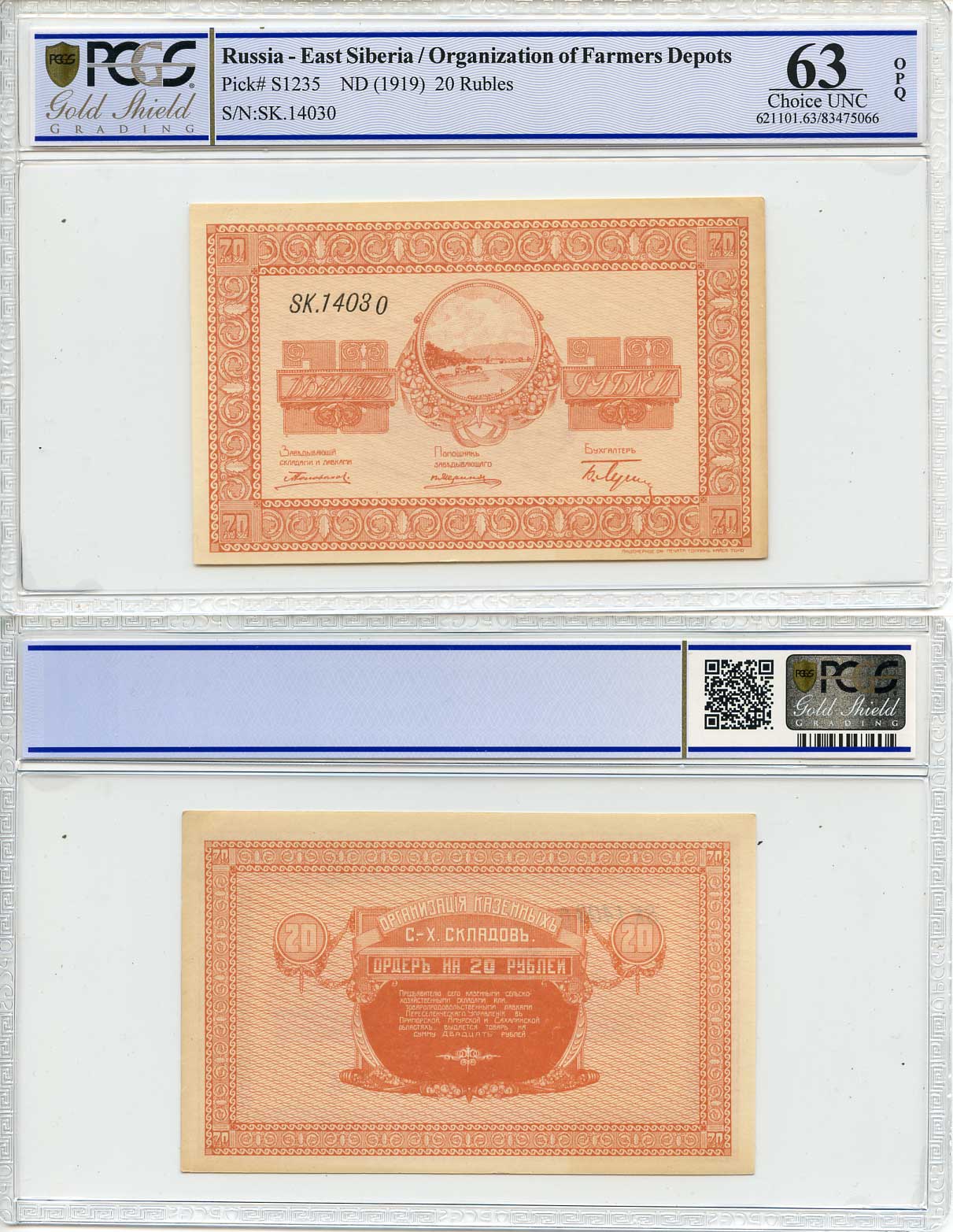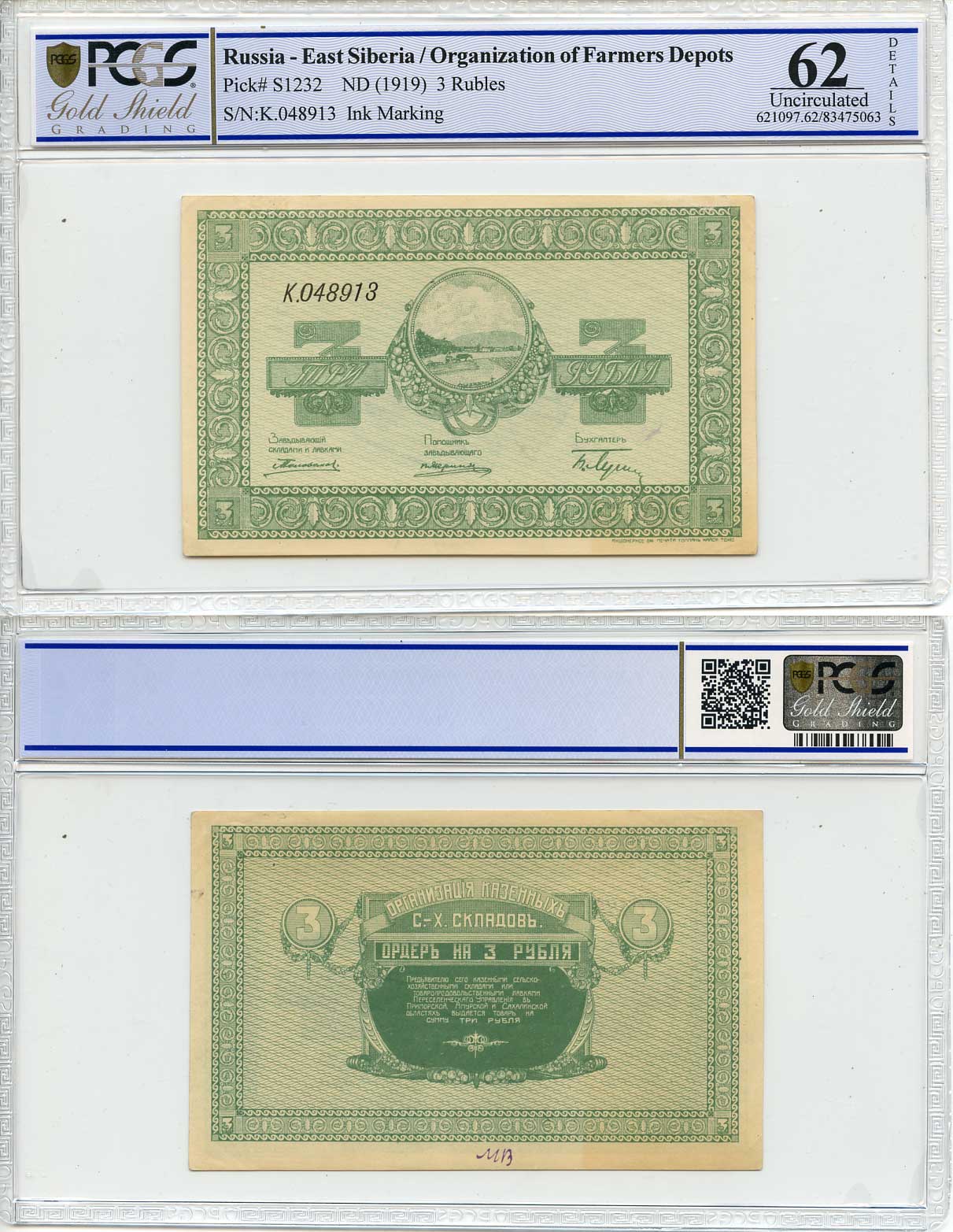 Никольск-Уссурийск. Приморская область 1, 3, 5, 10, 20, 40 и 100 рублей ND (1919) Переселенческое управление. Организация Сельско-Хозяйственных складов. Ордер. В слабах PCGS 62-64 Кардаков, с. 243, раздел 40, № 1-7, Pick S1231-S1237 бумага UNC 452-2-19