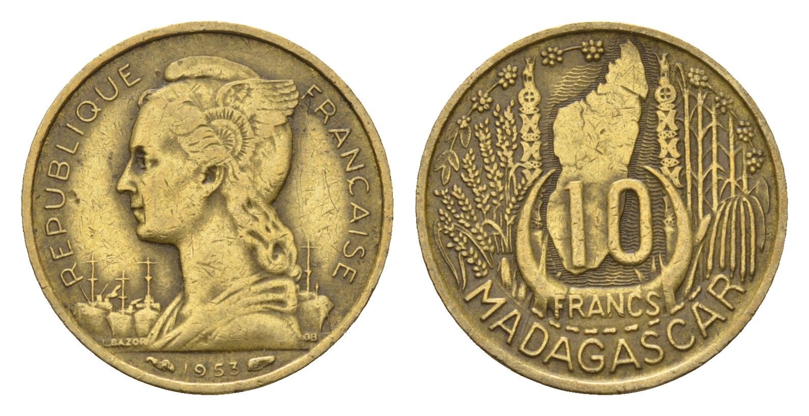 Мадагаскар 10 франков 1953 год-тип KM 6 алюминиевая бронза 08-947