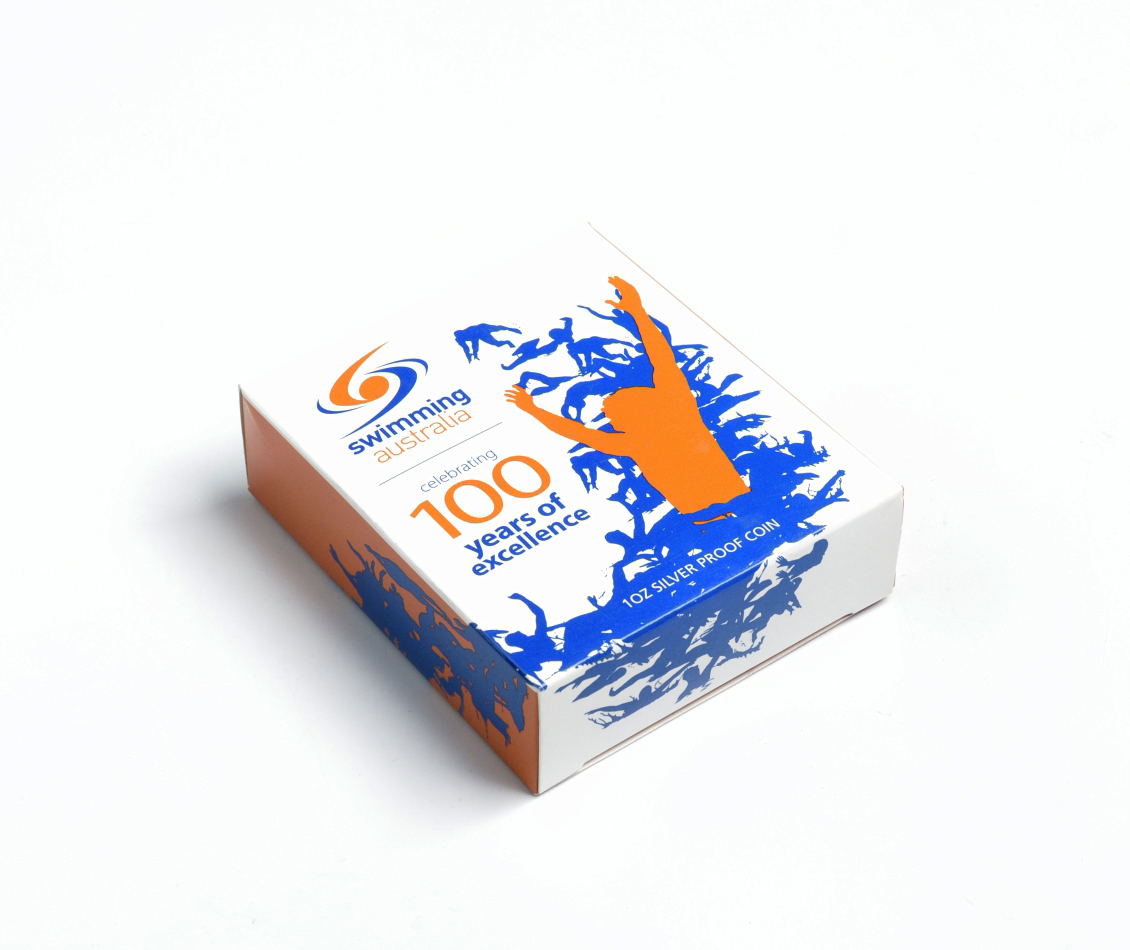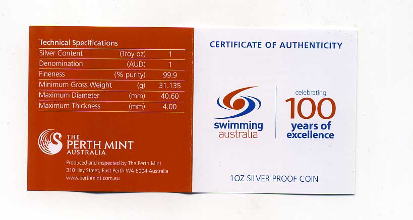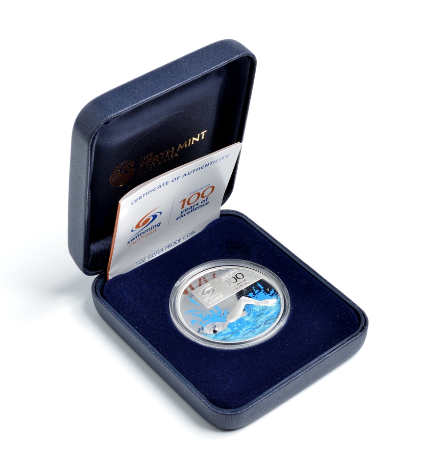 Австралия 1 доллар 2009 100 лет спортивному плаванию в Австралии, цветная эмаль, коробка, сертификат серебро PROOF 8-1-05-06