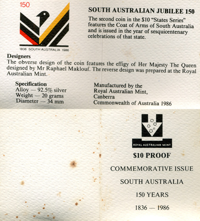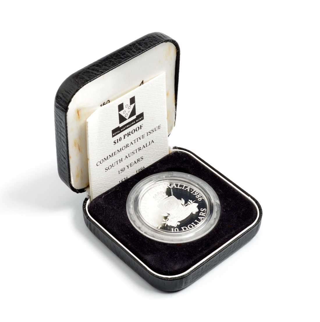 Австралия 10 долларов 1986 150 лет штату Южная Австралия, в оригинальной коробке, с сертификатом KM 88 серебро PROOF 4-3-4-36