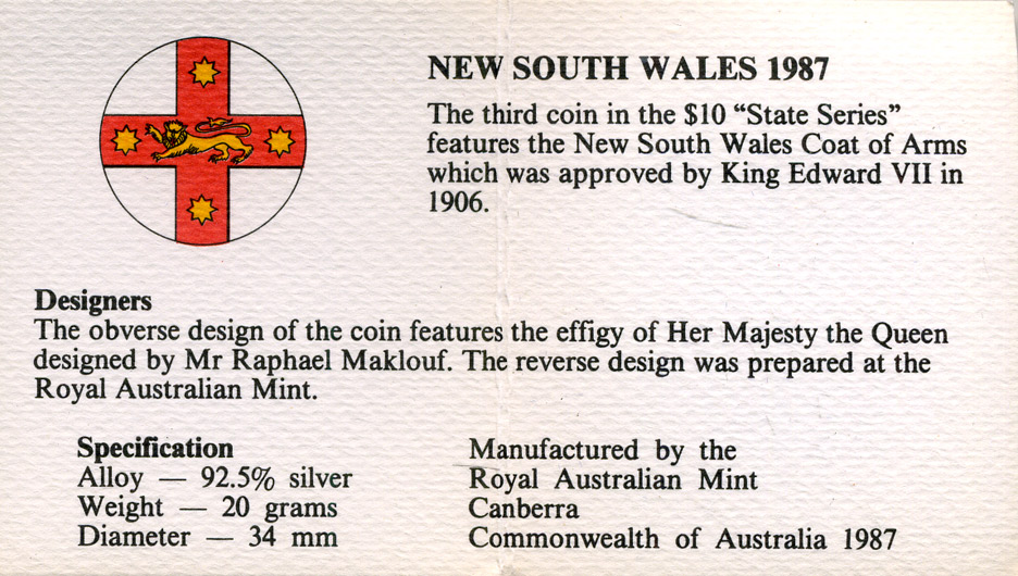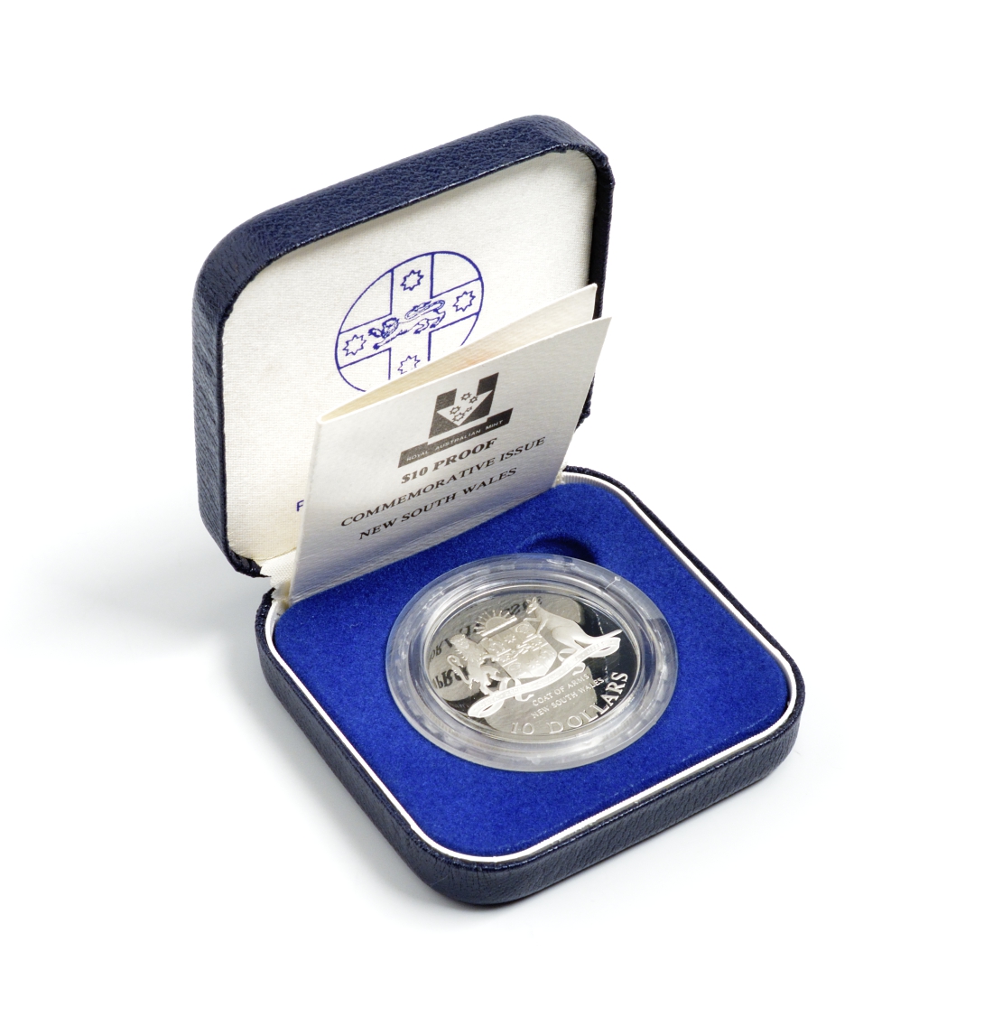 Австралия 10 долларов 1987 Новый Южный Уэльс, в оригинальной коробке, с сертификатом KM 93 серебро PROOF 4-3-4-35