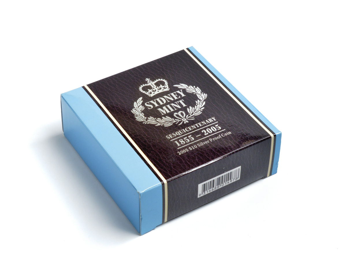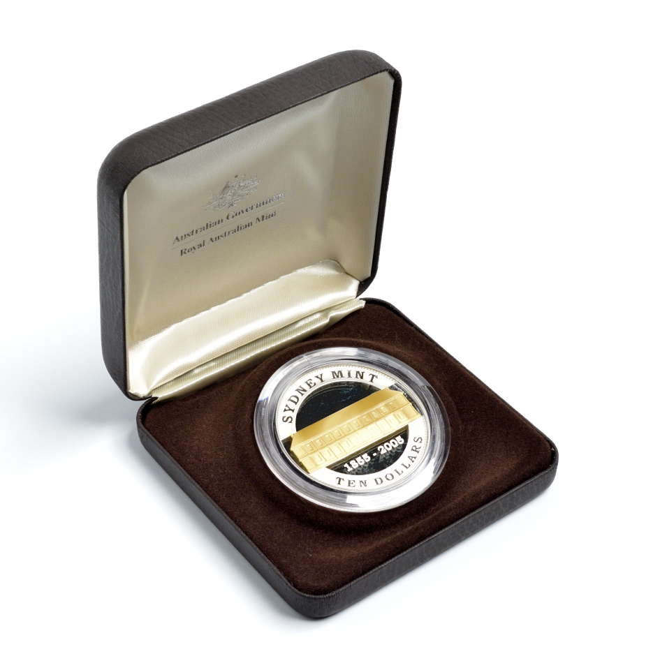 Австралия 10 долларов 2005 150 лет монетному двору в Сиднее, коробка, сертификат, серебро, позолота KM 751 серебро PROOF 00-00