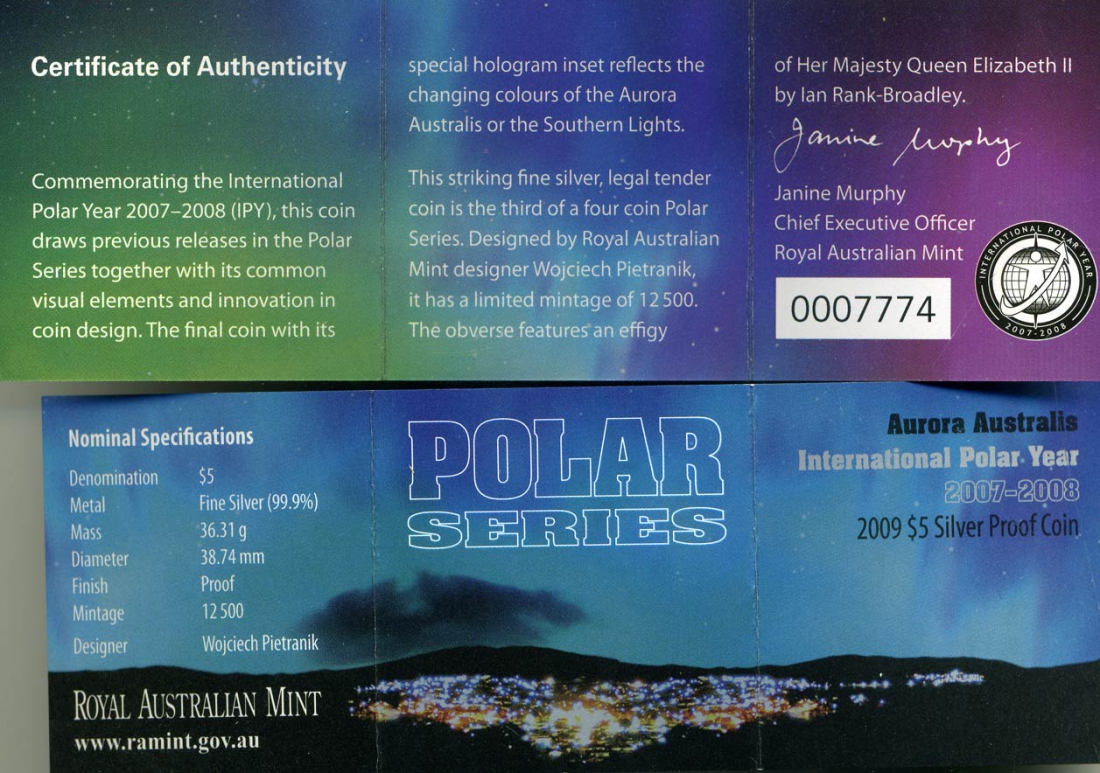 Австралия 5 долларов 2009 Международный полярный год 2007-2008, австралийское северное сияние, голограмма KM 1081 серебро PROOF 4-3-3-07