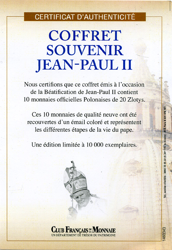 --Польша набор из 10 монет 2011 беатификация понтифика папы Иоанна Павла II (1920-2005), в оригинальной коробке с сертификатом, цветная эмаль на 20 злотых UNC 5-5-1-01НовинкиАнтичность и раннее СредневековьеМонеты - ГерманияМонеты - ЕвропаМонеты - Австралия и ОкеанияМонеты - АзияМонеты - АмерикаМонеты - АфрикаМонеты - Россия, СССР, страны СНГ и БалтииБанкнотыАксессуары, ЛитератураОткрытки, карточкиАкции, облигацииЖетоны, Медали, ЗнакиМаркиКартины, декоративно-прикладное искусство