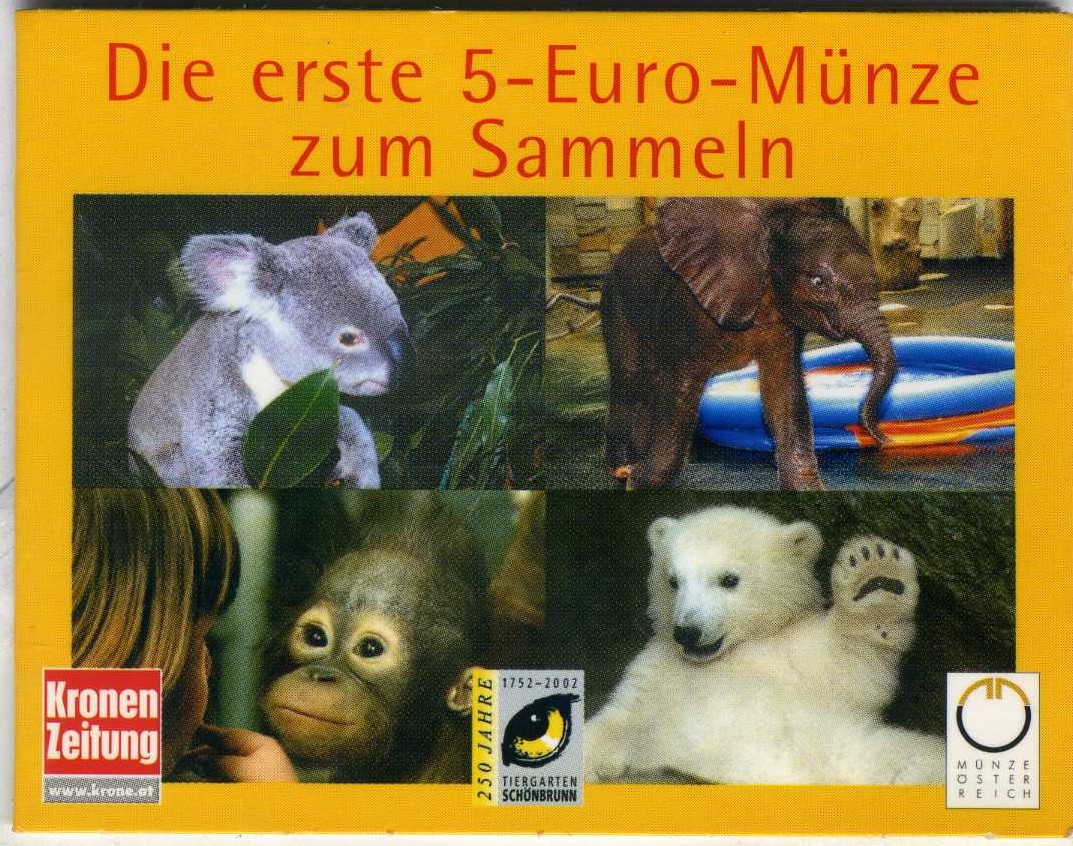 Австрия 5 евро 2002 250 лет Шенбруннскому зоопарку, в оригинальном буклете, белый медведь KM 3091 серебро UNC 7-5-6-39