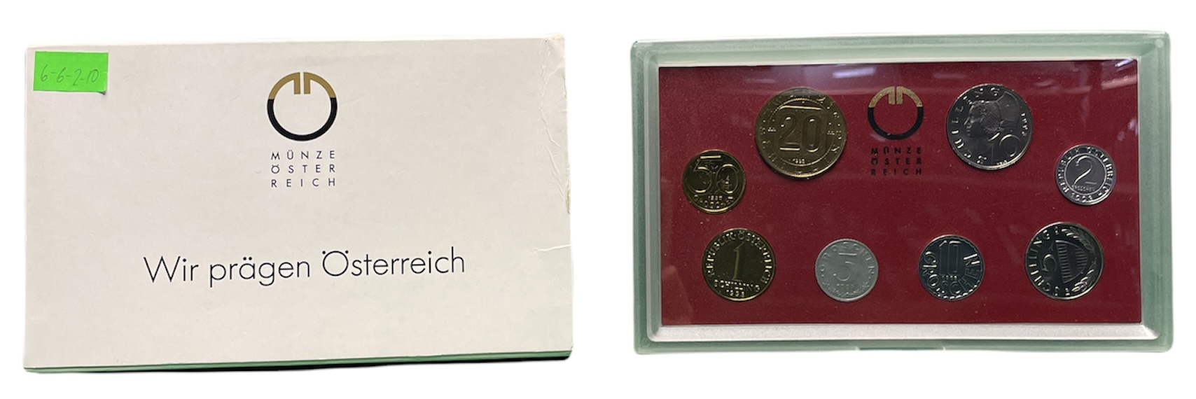 Австрия набор из 8 монет 1993 официальный набор, 2, 5, 10, 50 грошей, 1, 5, 10, 20 шиллингов, девять провинций Австрии, в пластике KM MS 2 UNC 6-6-2-10