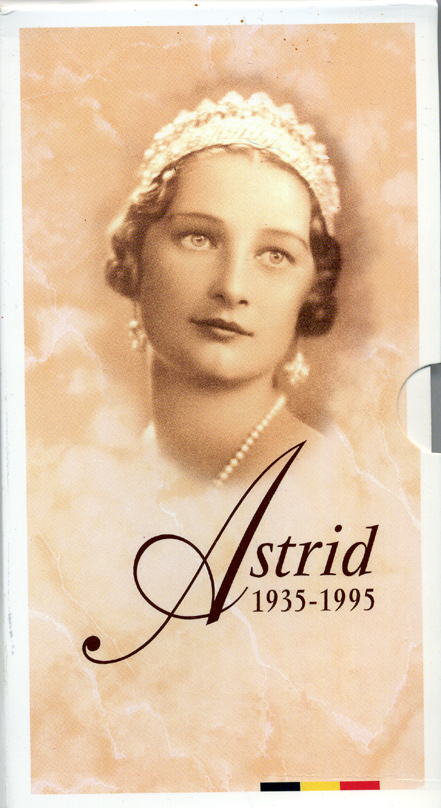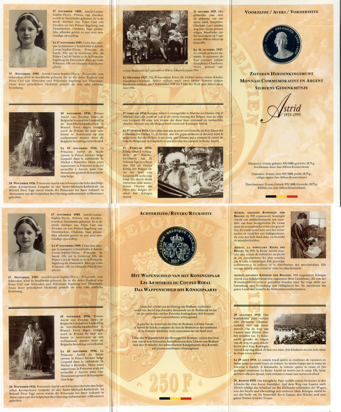Бельгия 250 франков 1995 Belgie-Belgique, 60 лет со дня смерти королевы Астрид (1935-1995), в оригинальном буклете, в запайке KM 199 серебро PROOF 6-5-3-12