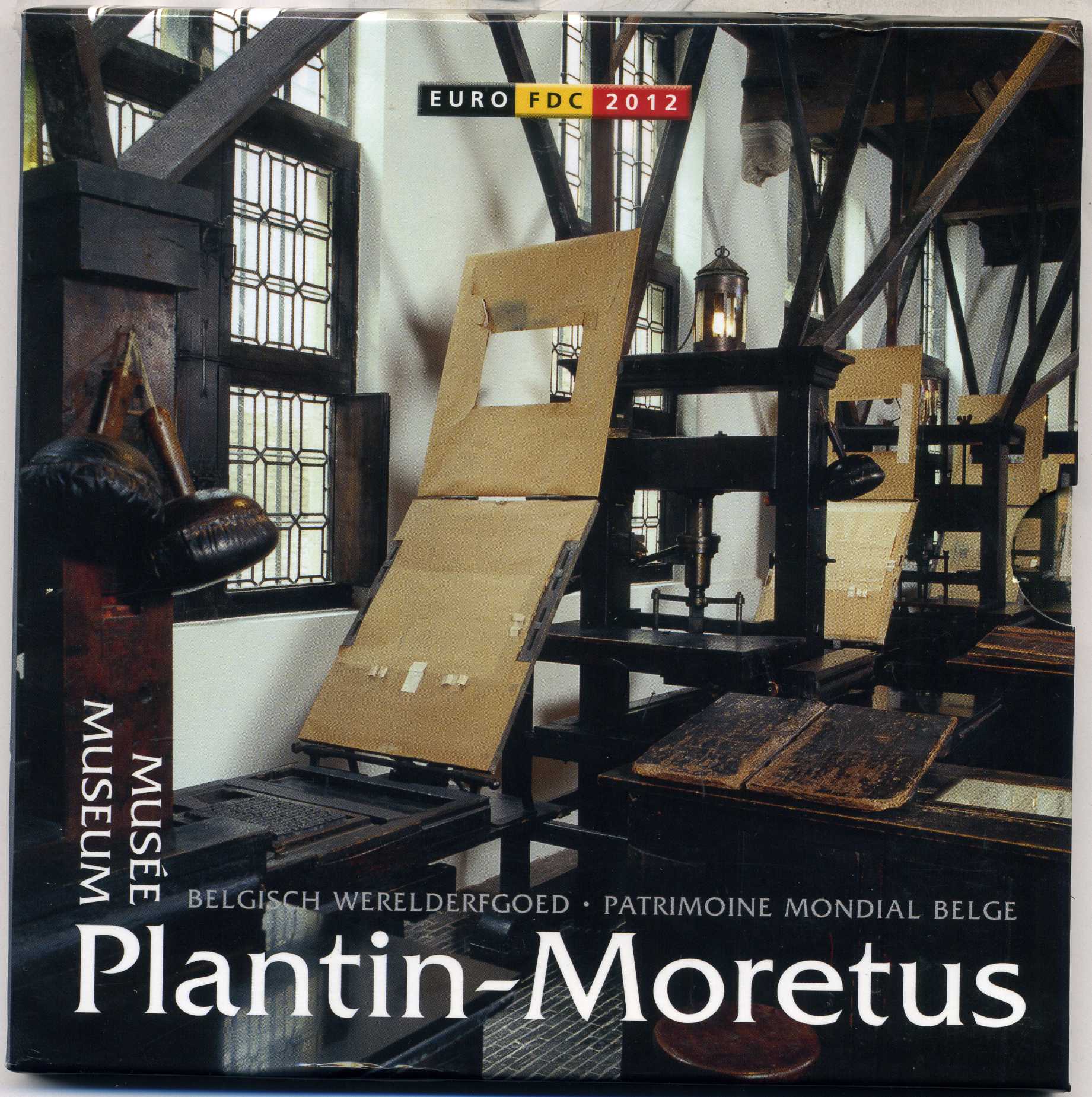 Бельгия евронабор из 8 монет + жетон 2012 музей Плантена - Моретуса в Антверпене, 1, 2, 5, 10, 20, 50 евроцентов, 1, 2 евро, запайка, буклет BUNC 4-5-3-22