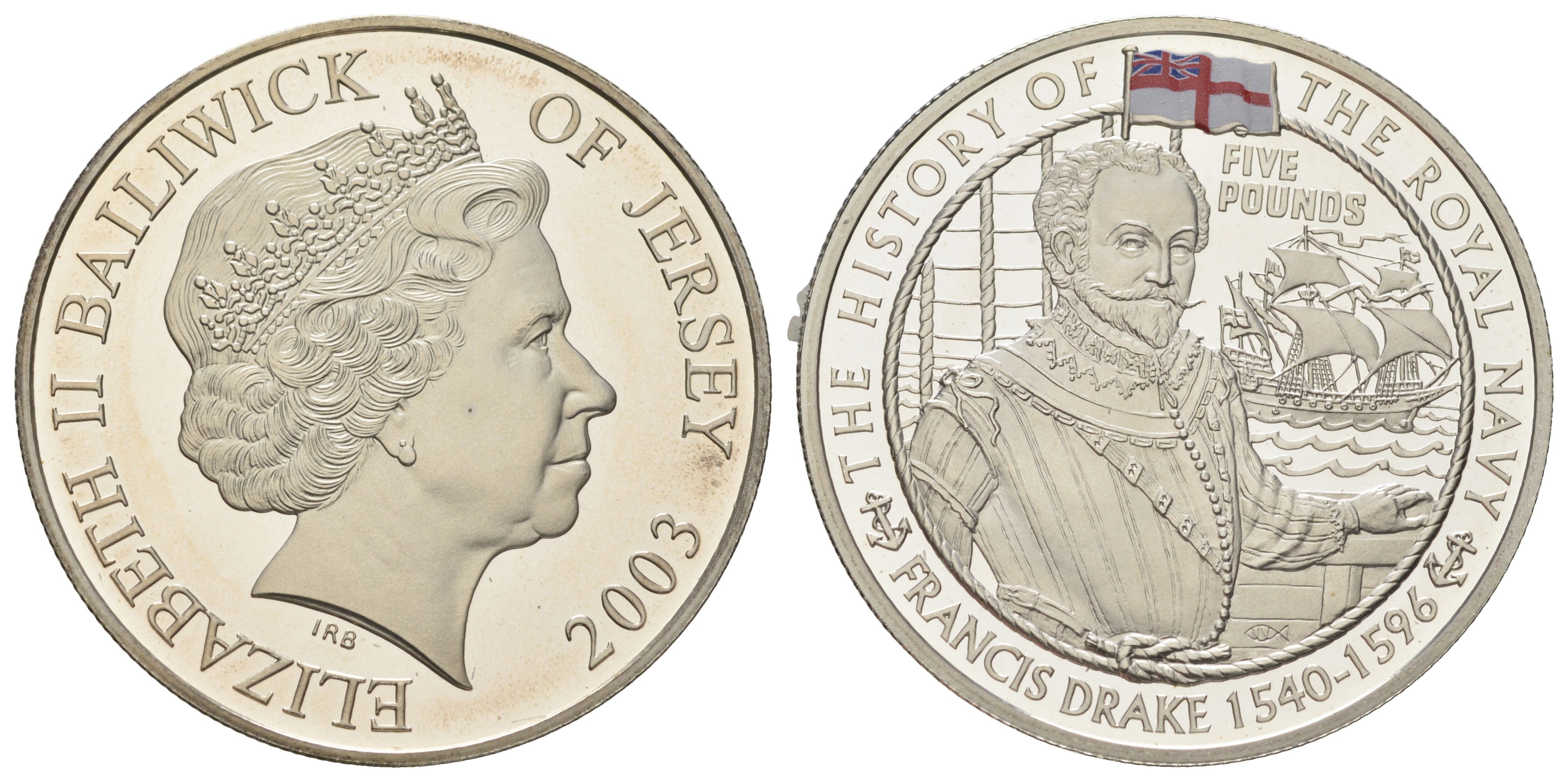 Джерси 5 фунтов 2003 История Королевского флота - Фрэнсис Дрейк KM 130a серебро PROOF 11-085-14